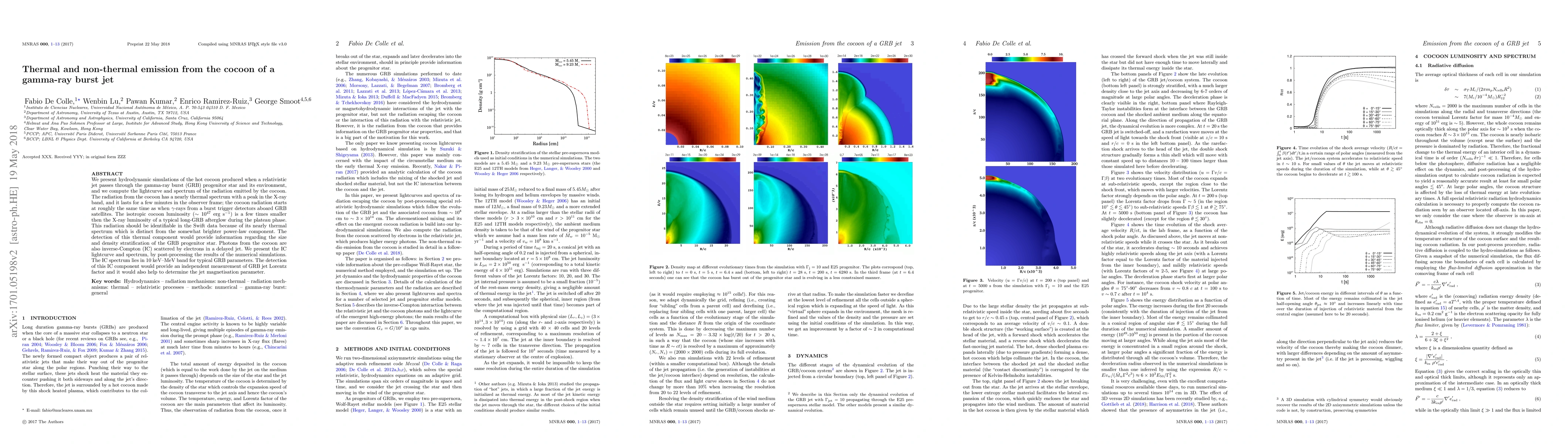 This paper presents hydrodynamic simulations of the hot cocoon formed by a relativistic jet from a gamma-ray burst (GRB), analyzing both thermal and non-thermal emissions. The thermal radiation from the cocoon has a nearly thermal spectrum peaking in the X-ray band, lasting for a few minutes, and is detectable in Swift data.