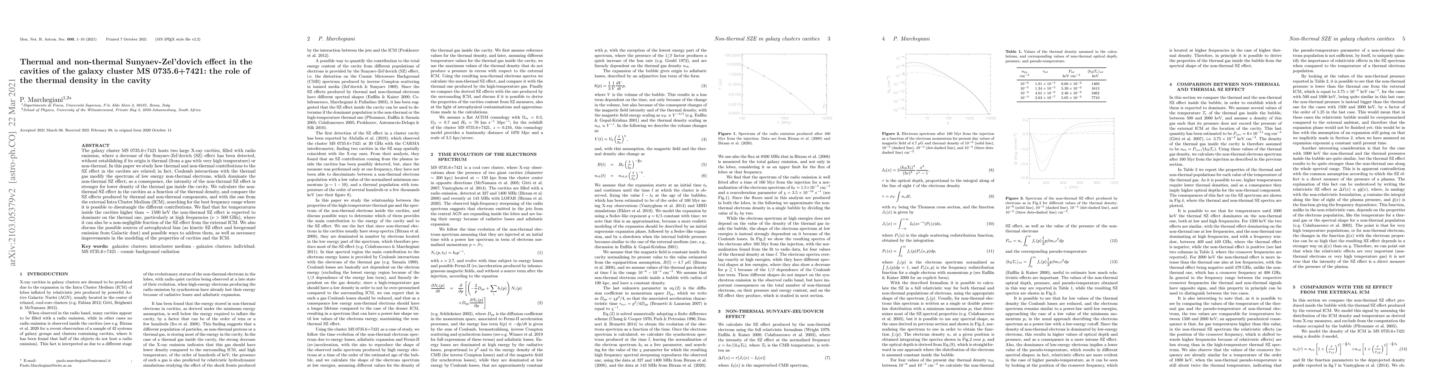 The galaxy cluster MS 0735.6+7421 hosts two large X-ray cavities, filled with radio emission, where a decrease of the Sunyaev-Zel'dovich (SZ) effect has been detected, without establishing if its origin is thermal (from a gas with very high temperature) or non-thermal. In this paper we study how thermal and non-thermal contributions to the SZ effect in the cavities are related; in fact, Coulomb interactions with the thermal gas modify the spectrum of low energy non-thermal electrons, which dominate the non-thermal SZ effect; as a consequence, the intensity of the non-thermal SZ effect is stronger for lower density of the thermal gas inside the cavity. We calculate the non-thermal SZ effect in the cavities as a function of the thermal density, and compare the SZ effects produced by thermal and non-thermal components, and with the one from the external Intra Cluster Medium (ICM), searching for the best frequency range where it is possible to disentangle the different contributions. We find that for temperatures inside the cavities higher than $\sim1500$ keV the non-thermal SZ effect is expected to dominate on the thermal one, particularly at high frequencies ($\nu>500$ GHz), where it can also be a non-negligible fraction of the SZ effect from the external ICM. We also discuss the possible sources of astrophysical bias (as kinetic SZ effect and foreground emission from Galactic dust) and possible ways to address them, as well as necessary improvements in the modeling of the properties of cavities and the ICM.