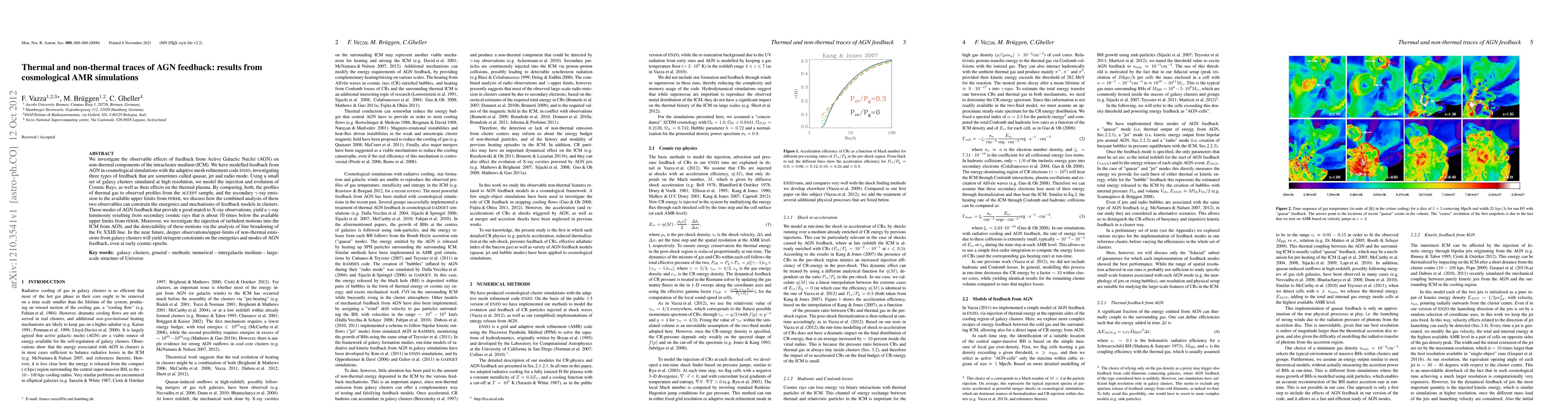 We investigate the observable effects of feedback from Active Galactic Nuclei (AGN) on non-thermal components of the intracluster medium (ICM). We have modelled feedback from AGN in cosmological simulations with the adaptive mesh refinement code ENZO, investigating three types of feedback that are sometimes called quasar, jet and radio mode. Using a small set of galaxy clusters simulated at high resolution, we model the injection and evolution of Cosmic Rays, as well as their effects on the thermal plasma. By comparing, both, the profiles of thermal gas to observed profiles from the ACCEPT sample, and the secondary gamma-ray emission to the available upper limits from FERMI, we discuss how the combined analysis of these two observables can constrain the energetics and mechanisms of feedback models in clusters. Those modes of AGN feedback that provide a good match to X-ray observations, yield a gamma-ray luminosity resulting from secondary cosmic rays that is about below the available upper limits from FERMI. Moreover, we investigate the injection of turbulent motions into the ICM from AGN, and the detectability of these motions via the analysis of line broadening of the Fe XXIII line. In the near future, deeper observations/upper-limits of non-thermal emissions from galaxy clusters will yield stringent constraints on the energetics and modes of AGN feedback, even at early cosmic epochs.