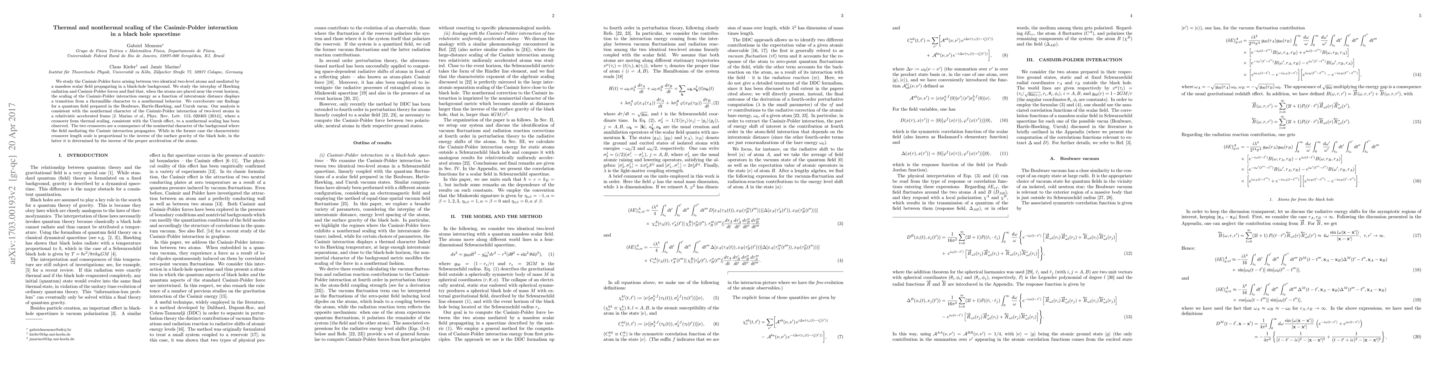 This paper investigates the Casimir-Polder force between two-level atoms in a black hole spacetime, revealing a transition from thermal to nonthermal scaling as atoms approach the event horizon. The study confirms this crossover behavior across different quantum field vacua and aligns with findings in relativistic accelerated frames.