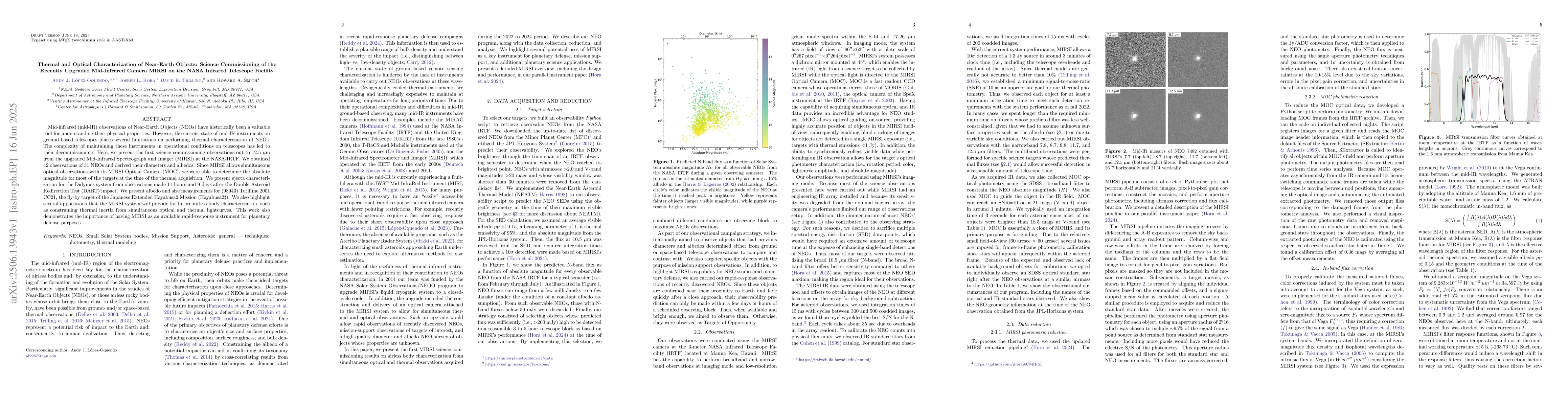 Mid-infrared (mid-IR) observations of Near-Earth Objects (NEOs) have historically been a valuable tool for understanding their physical properties. However, the current state of mid-IR instruments on ground-based telescopes places several limitations on performing thermal characterization of NEOs. The complexity of maintaining these instruments in operational conditions on telescopes has led to their decommissioning. Here, we present the first science commissioning observations out to 12.5 microns from the upgraded Mid-Infrared Spectrograph and Imager (MIRSI) at the NASA-IRTF. We obtained 42 observations of 31 NEOs and derived their diameters and albedos. Since MIRSI allows simultaneous optical observations with its MIRSI Optical Camera (MOC), we were able to determine the absolute magnitude for most of the targets at the time of the thermal acquisition. We present ejecta characterization for the Didymos system from observations made 11 hours and 9 days after the Double Asteroid Redirection Test (DART) impact. We present albedo and size measurements for (98943) Torifune 2001 CC21, the fly-by target of the Japanese Extended Hayabusa2 Mission. We also highlight several applications that the MIRSI system will provide for future airless body characterization, such as constraining thermal inertia from simultaneous optical and thermal lightcurves. This work also demonstrates the importance of having MIRSI as an available rapid-response instrument for planetary defense purposes.