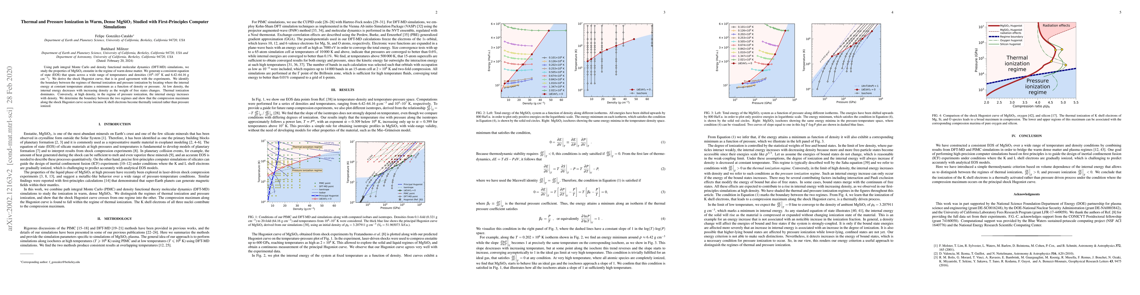 This study uses first-principles simulations to explore MgSiO$_3$ enstatite in warm dense matter conditions, generating an equation of state and identifying the transition between thermal and pressure ionization regimes. The compression maximum along the shock Hugoniot curve is attributed to thermal ionization of K shell electrons.