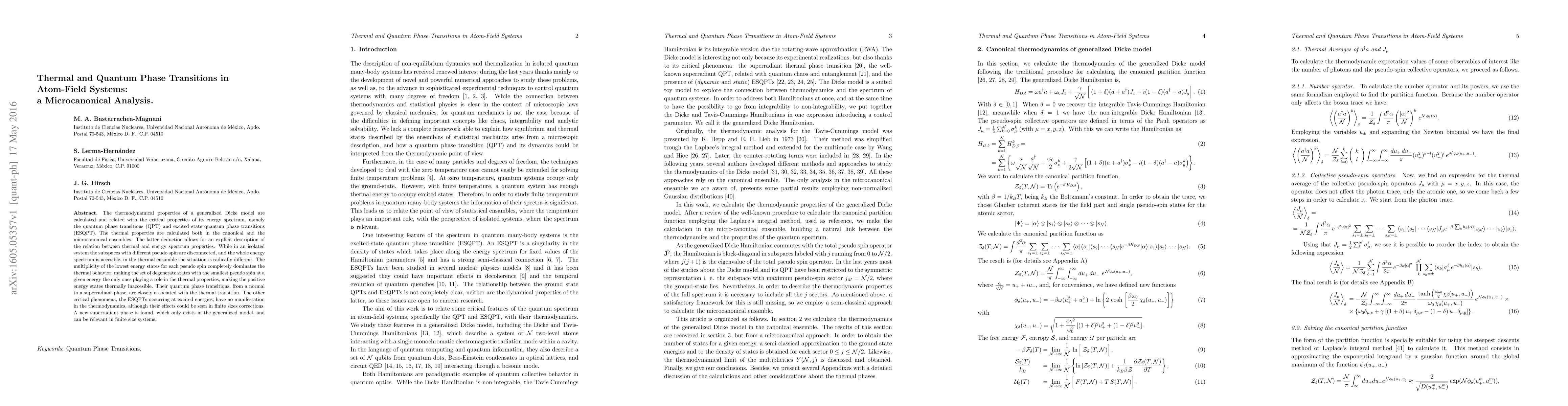 This paper investigates the thermodynamic properties of a generalized Dicke model, focusing on the connections between thermal and quantum phase transitions. It reveals that thermal behavior in the microcanonical ensemble is dominated by the lowest energy states, while quantum phase transitions and excited state quantum phase transitions have distinct impacts on thermodynamics and energy spectrum properties.