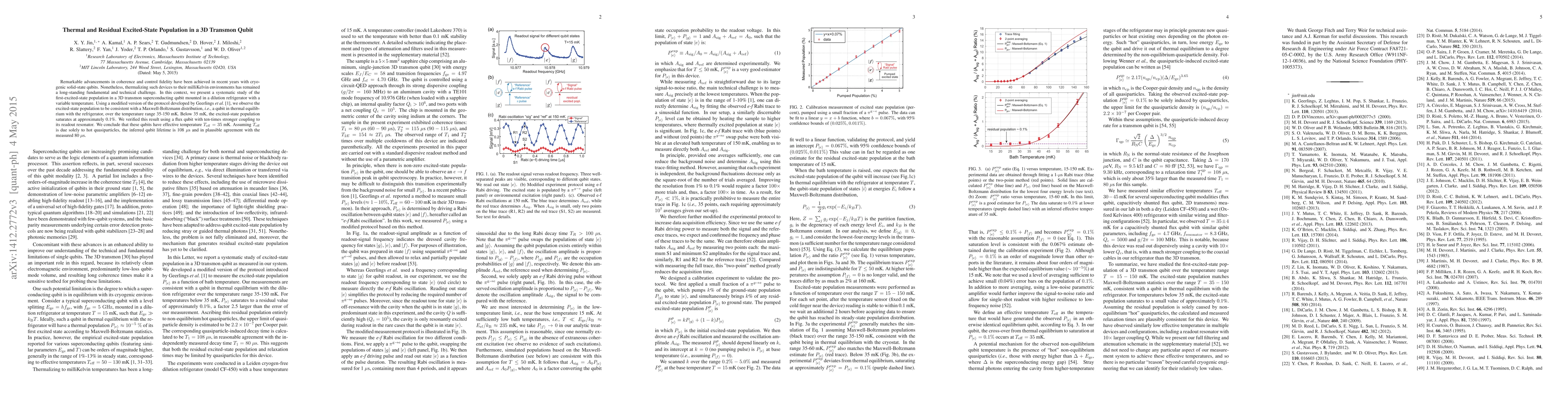 Researchers studied a 3D transmon qubit's excited-state population at varying temperatures, finding that it behaves like thermal equilibrium below 35 mK, with an effective temperature of 35 mK.