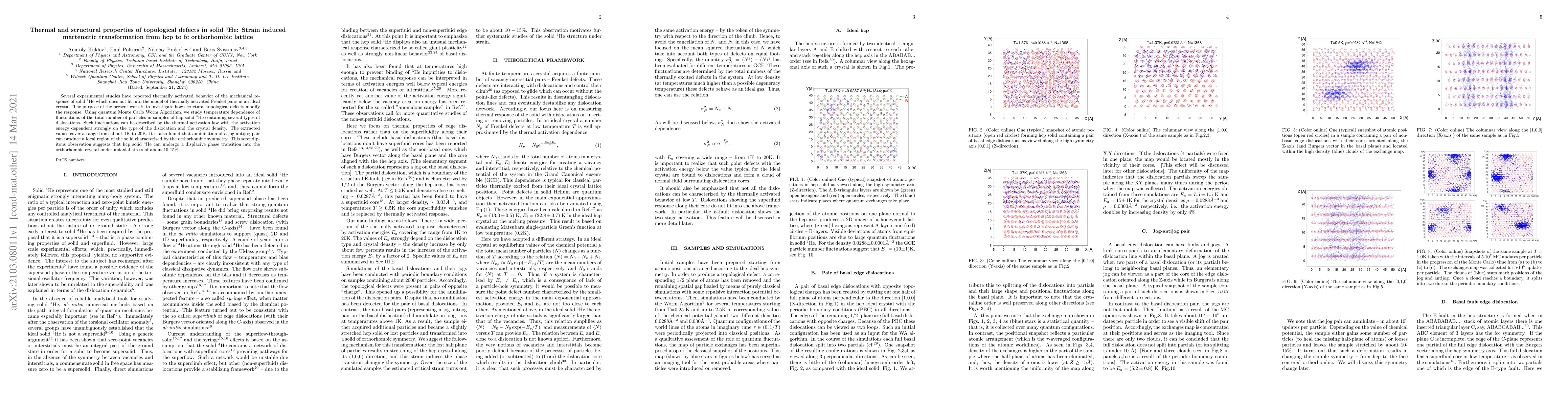 This paper investigates how topological defects in solid Helium-4 affect its thermal and mechanical behavior, revealing that dislocations influence the temperature-dependent fluctuations in particle number. It also discovers a strain-induced martensitic transformation from hcp to orthorhombic lattice under uniaxial stress.