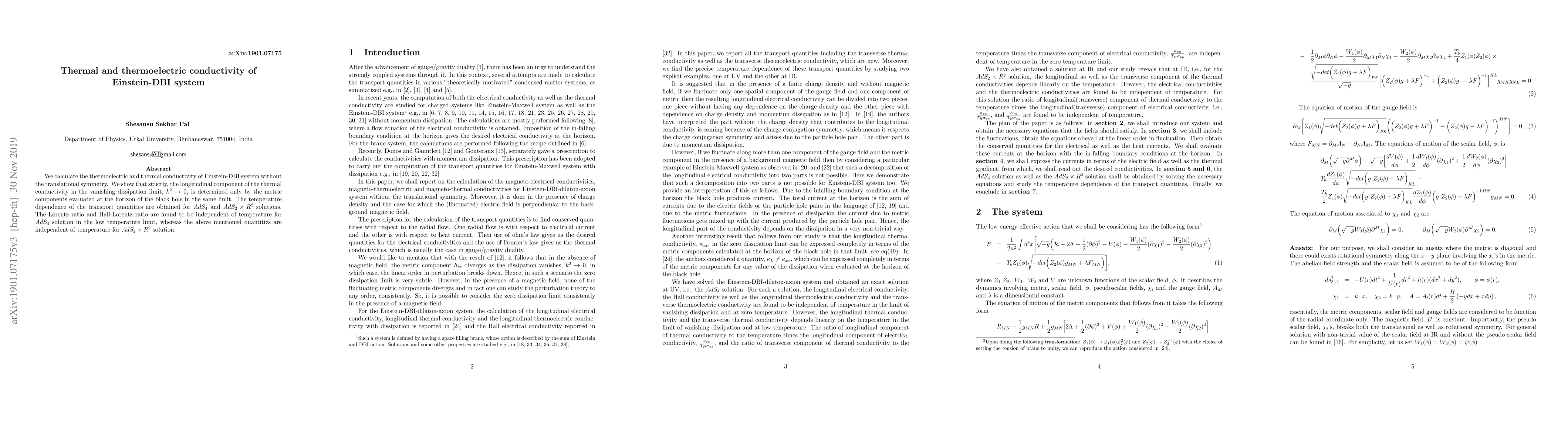 This paper investigates the thermoelectric and thermal conductivity in an Einstein-DBI system lacking translational symmetry. It finds that the longitudinal thermal conductivity in the limit of negligible dissipation is determined by metric components at the black hole horizon, with temperature dependencies analyzed for $AdS_4$ and $AdS_2\times R^2$ solutions. Notably, the Lorentz and Hall-Lorentz ratios are temperature-independent in the low-temperature limit for both solutions.