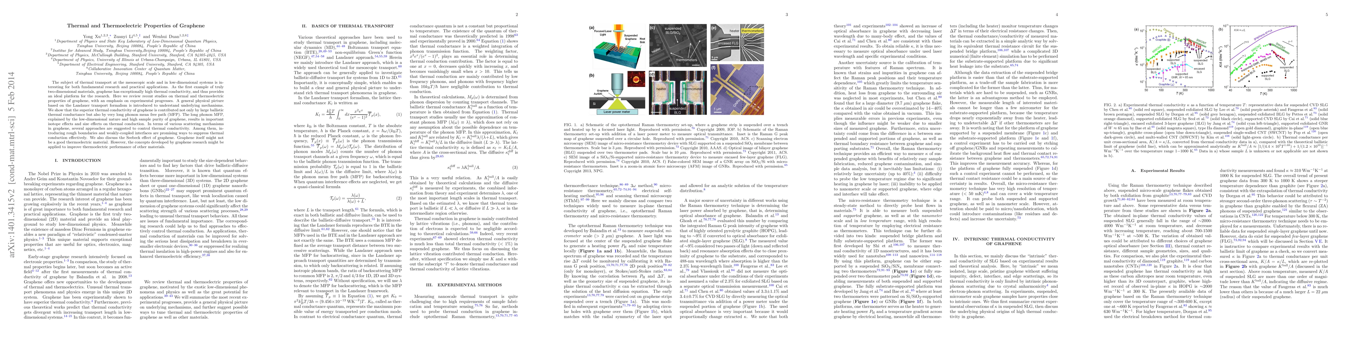 The subject of thermal transport at the mesoscopic scale and in low-dimensional systems is interesting for both fundamental research and practical applications. As the first example of truly two-dimensional materials, graphene has exceptionally high thermal conductivity, and thus provides an ideal platform for the research. Here we review recent studies on thermal and thermoelectric properties of graphene, with an emphasis on experimental progresses. A general physical picture based on the Landauer transport formalism is introduced to understand underlying mechanisms. We show that the superior thermal conductivity of graphene is contributed not only by large ballistic thermal conductance but also by very long phonon mean free path (MFP). The long phonon MFP, explained by the low-dimensional nature and high sample purity of graphene, results in important isotope effects and size effects on thermal conduction. In terms of various scattering mechanisms in graphene, several approaches are suggested to control thermal conductivity. Among them, introducing rough boundaries and weakly-coupled interfaces are promising ways to suppress thermal conduction effectively. We also discuss the Seebeck effect of graphene. Graphene itself might not be a good thermoelectric material. However, the concepts developed by graphene research might be applied to improve thermoelectric performance of other materials.