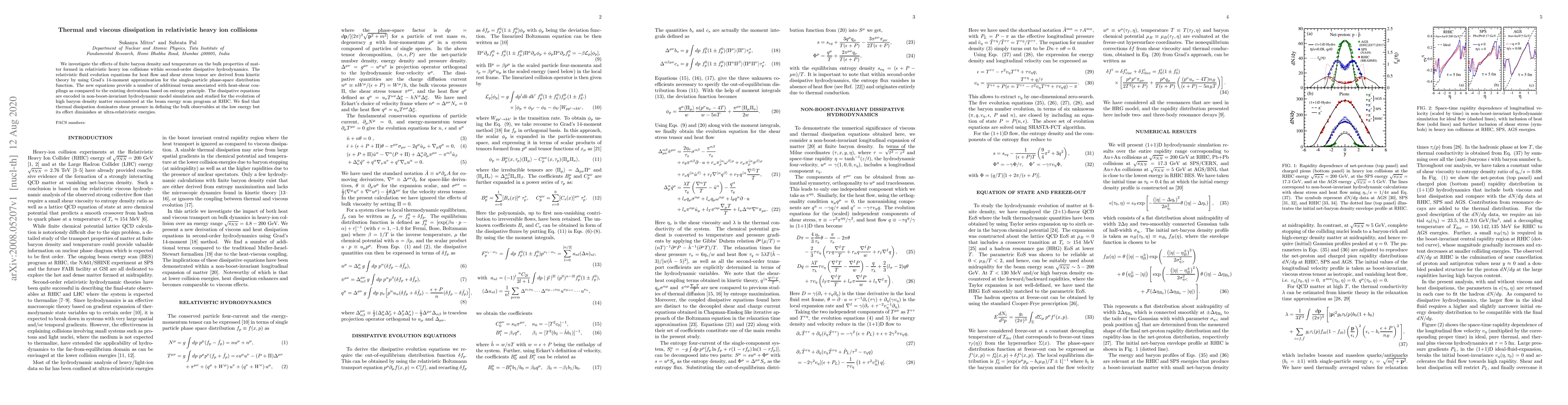 We investigate the effects of finite baryon density and temperature on the bulk properties of matter formed in relativistic heavy ion collisions within second-order dissipative hydrodynamics. The relativistic fluid evolution equations for heat flow and shear stress tensor are derived from kinetic theory by using Grad's 14-moment approximation for the single-particle phase-space distribution function. The new equations provide a number of additional terms associated with heat-shear couplings as compared to the existing derivations based on entropy principle. The dissipative equations are encoded in non-boost-invariant hydrodynamic model simulation and studied for the evolution of high baryon density matter encountered at the beam energy scan program at RHIC. We find that thermal dissipation dominates shear pressure in defining the bulk observables at the low energy but its effect diminishes at ultra-relativistic energies.