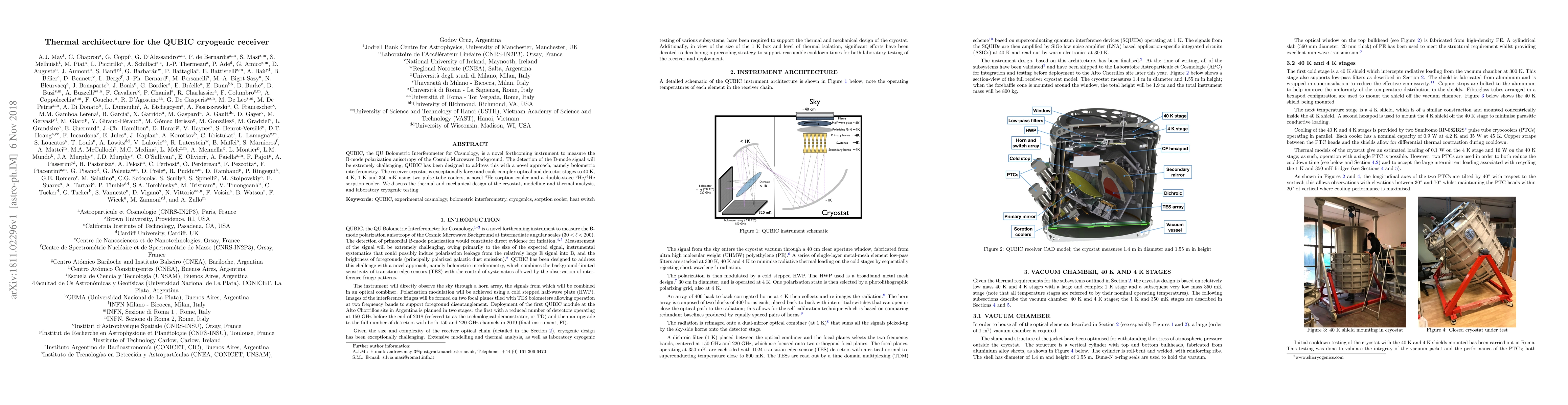 The QUBIC cryogenic receiver employs a sophisticated thermal architecture with multiple cooling stages to achieve ultra-low temperatures for detecting B-mode polarization anisotropy in the Cosmic Microwave Background. The design includes pulse tube coolers, 4He sorption coolers, and a double-stage 3He/4He sorption cooler to cool various optical and detector stages.
