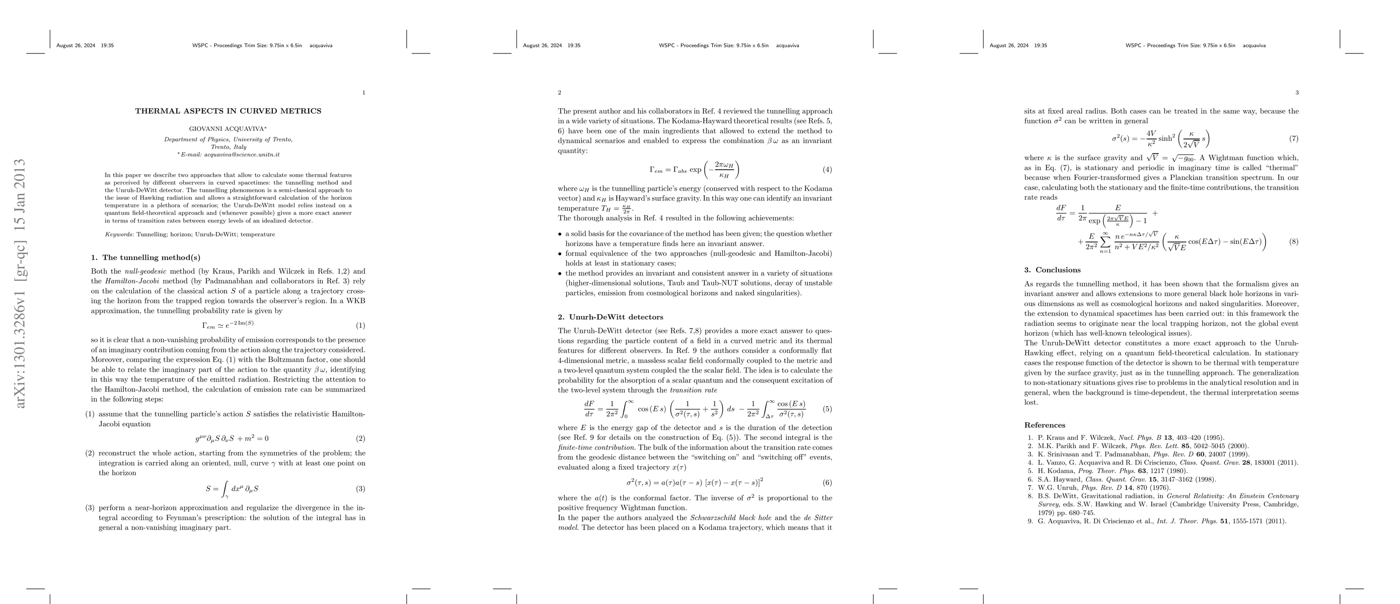 In this paper we describe two approaches that allow to calculate some thermal features as perceived by different observers in curved spacetimes: the tunnelling method and the Unruh-DeWitt detector. The tunnelling phenomenon is a semi-classical approach to the issue of Hawking radiation and allows a straightforward calculation of the horizon temperature in a plethora of scenarios; the Unruh-DeWitt model relies instead on a quantum field-theoretical approach and (whenever possible) gives a more exact answer in terms of transition rates between energy levels of an idealized detector.