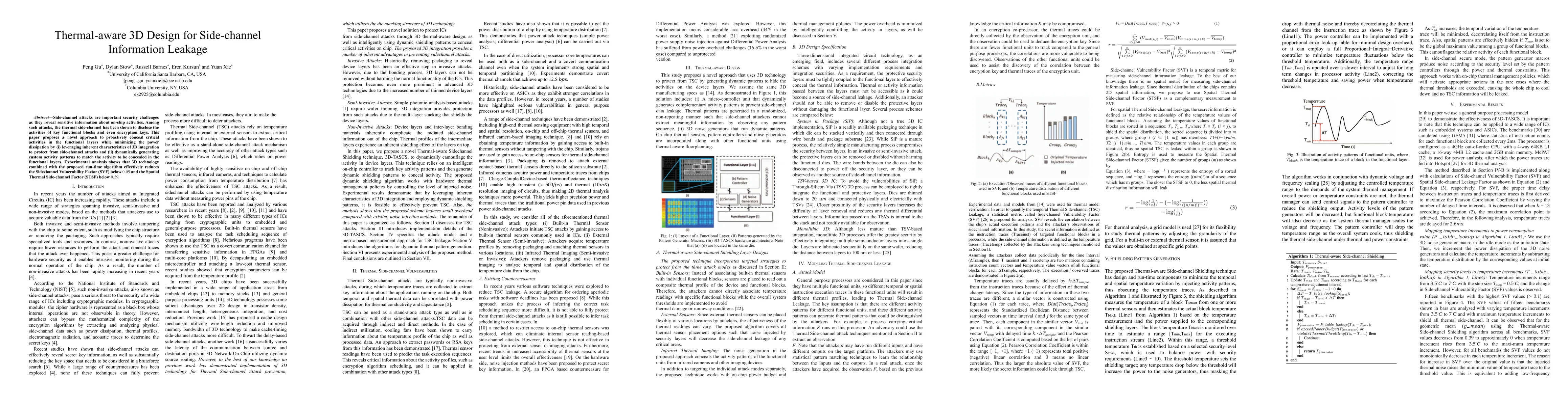 Side-channel attacks are important security challenges as they reveal sensitive information about on-chip activities. Among such attacks, the thermal side-channel has been shown to disclose the activities of key functional blocks and even encryption keys. This paper proposes a novel approach to proactively conceal critical activities in the functional layers while minimizing the power dissipation by (i) leveraging inherent characteristics of 3D integration to protect from side-channel attacks and (ii) dynamically generating custom activity patterns to match the activity to be concealed in the functional layers. Experimental analysis shows that 3D technology combined with the proposed run-time algorithm effectively reduces the Side channel vulnerability Factor (SVF) below 0.05 and the Spatial Thermal Side-channel Factor (STSF) below 0.59.
