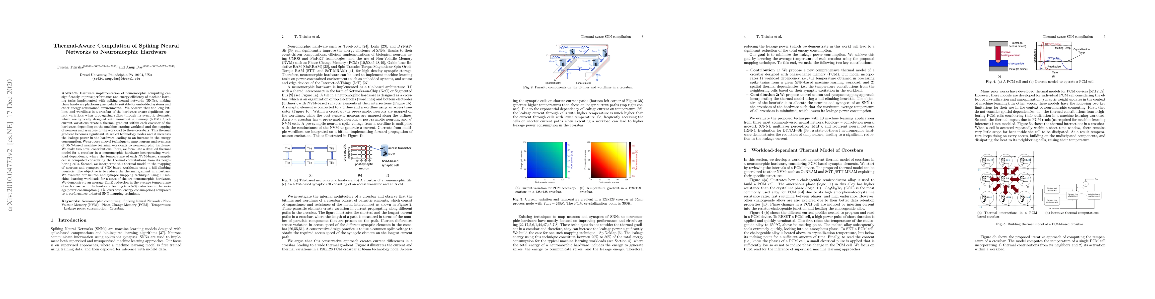 This paper proposes a thermal-aware compilation technique for mapping spiking neural networks to neuromorphic hardware to mitigate thermal gradients caused by current variations in the hardware's crossbar. The technique incorporates a detailed thermal model and a hill-climbing heuristic to reduce thermal gradients, achieving an average 11.4K temperature reduction and a 52% reduction in leakage power, resulting in an 11% lower total energy consumption.