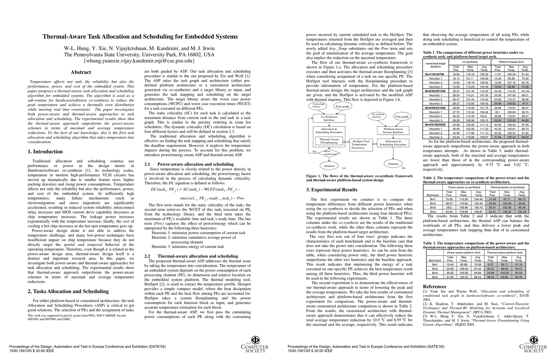 This paper proposes a thermal-aware task allocation and scheduling algorithm for embedded systems to reduce peak temperatures and achieve thermal uniformity while meeting real-time constraints. The thermal-aware approach outperforms power-aware schemes in temperature reduction, marking the first algorithm to consider temperature in task allocation and scheduling.