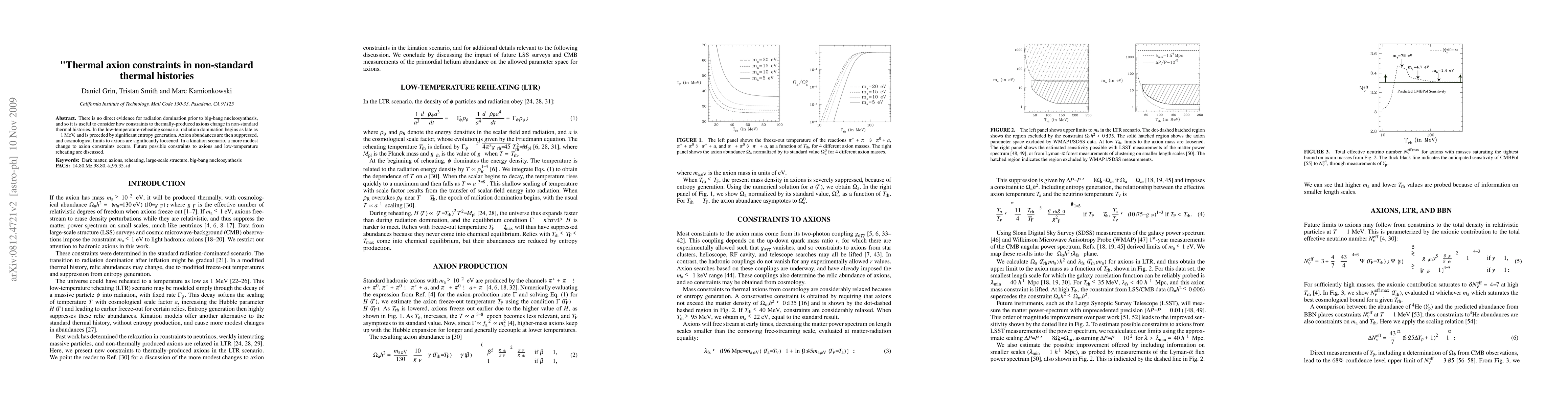 This paper explores how constraints on thermally-produced axions vary under non-standard thermal histories, finding that low-temperature reheating scenarios significantly loosen cosmological limits on axions compared to kination scenarios. Future research may provide further constraints on axions and low-temperature reheating.