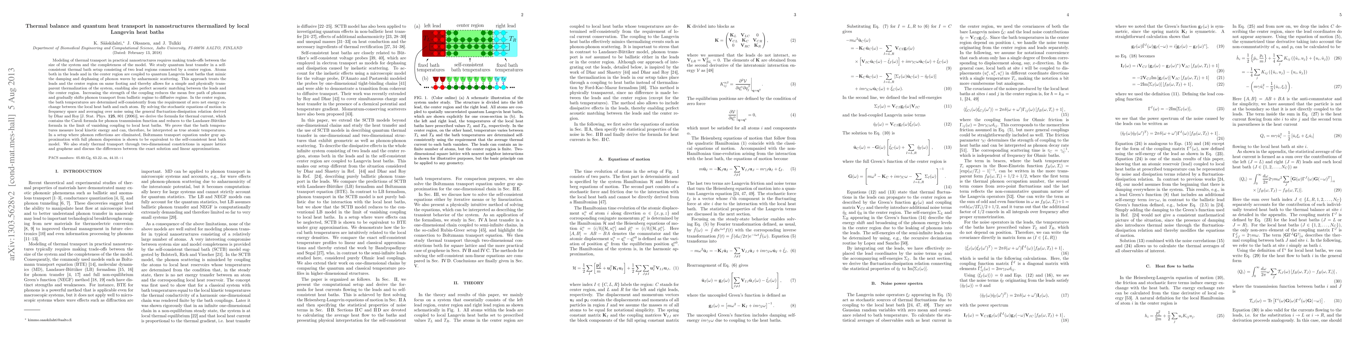 This paper models quantum heat transport in nanostructures using quantum Langevin heat baths to simulate phonon damping and dephasing. It finds that stronger coupling shifts phonon transport from ballistic to diffusive, and derives a formula for thermal current based on the Caroli formula and Landauer-Büttiker formalism.