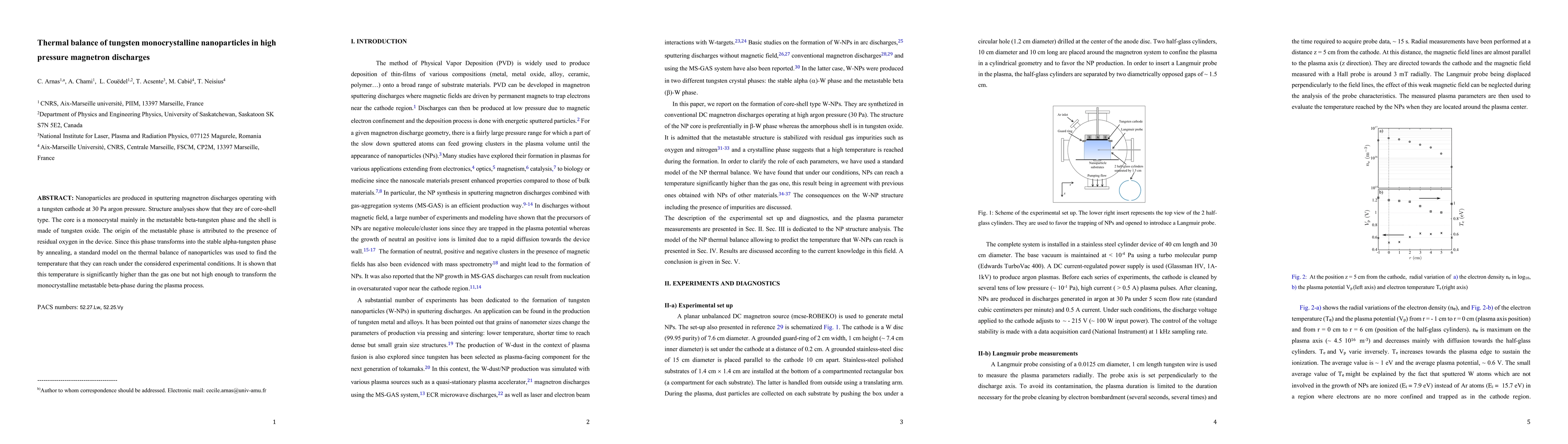 The paper presents a detailed thermal balance analysis of tungsten monocrystalline nanoparticles in high-pressure magnetron discharges, identifying the dominant heating and cooling mechanisms.