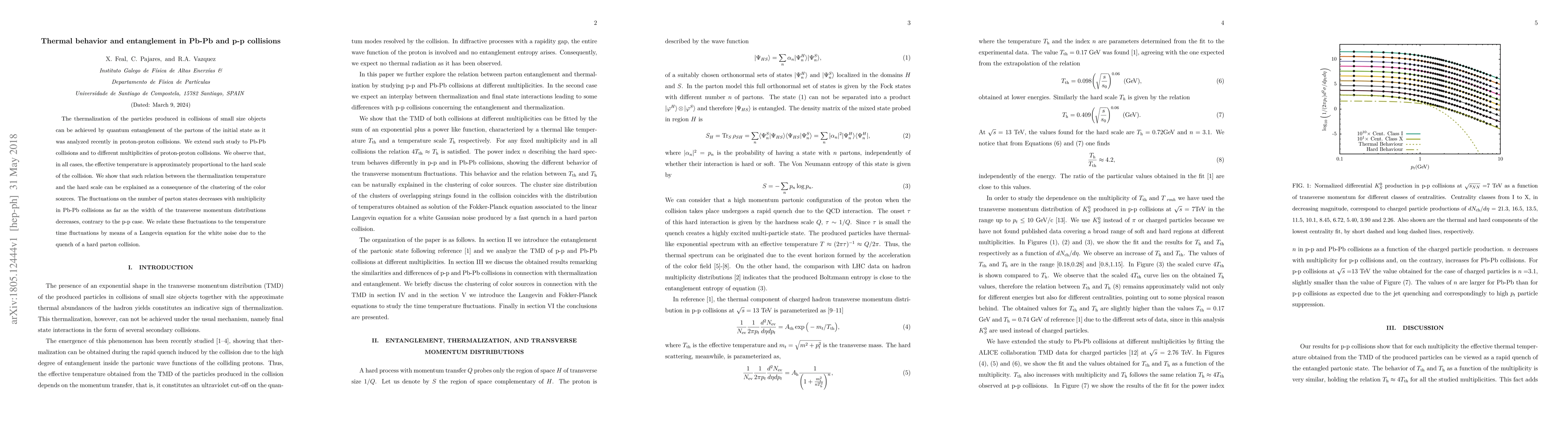 The thermalization of the particles produced in collisions of small size objects can be achieved by quantum entanglement of the partons of the initial state as it was analyzed recently in proton-proton collisions. We extend such study to Pb-Pb collisions and to different multiplicities of proton-proton collisions. We observe that, in all cases, the effective temperature is approximately proportional to the hard scale of the collision. We show that such relation between the thermalization temperature and the hard scale can be explained as a consequence of the clustering of the color sources. The fluctuations on the number of parton states decreases with multiplicity in Pb-Pb collisions as far as the width of the transverse momentum distributions decreases, contrary to the p-p case. We relate these fluctuations to the temperature time fluctuations by means of a Langevin equation for the white noise due to the quench of a hard parton collision.