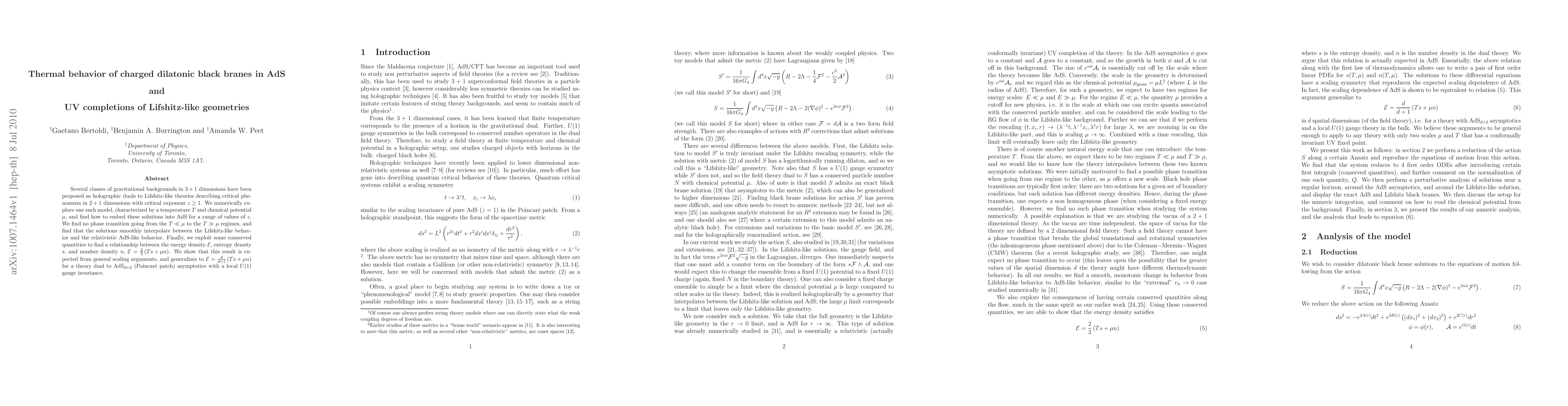 Several classes of gravitational backgrounds in $3+1$ dimensions have been proposed as holographic duals to Lifshitz-like theories describing critical phenomena in $2+1$ dimensions with critical exponent $z\geq 1$. We numerically explore one such model, characterized by a temperature $T$ and chemical potential $\mu$, and find how to embed these solutions into AdS for a range of values of $z$. We find no phase transition going from the $T\ll\mu$ to the $T\gg \mu$ regimes, and find that the solutions smoothly interpolate between the Lifshitz-like behavior and the relativistic AdS-like behavior. Finally, we exploit some conserved quantities to find a relationship between the energy density $\mc E$, entropy density $s$, and number density $n$, $\mc E=\frac{2}{3} \left(Ts+\mu n\right)$. We show that this result is expected from general scaling arguments, and generalizes to $\mc E= \frac{d}{d+1}\left(Ts+\mu n\right)$ for a theory dual to AdS$_{d+2}$ (Poincar\'e patch) asymptotics with a local $U(1)$ gauge invariance.