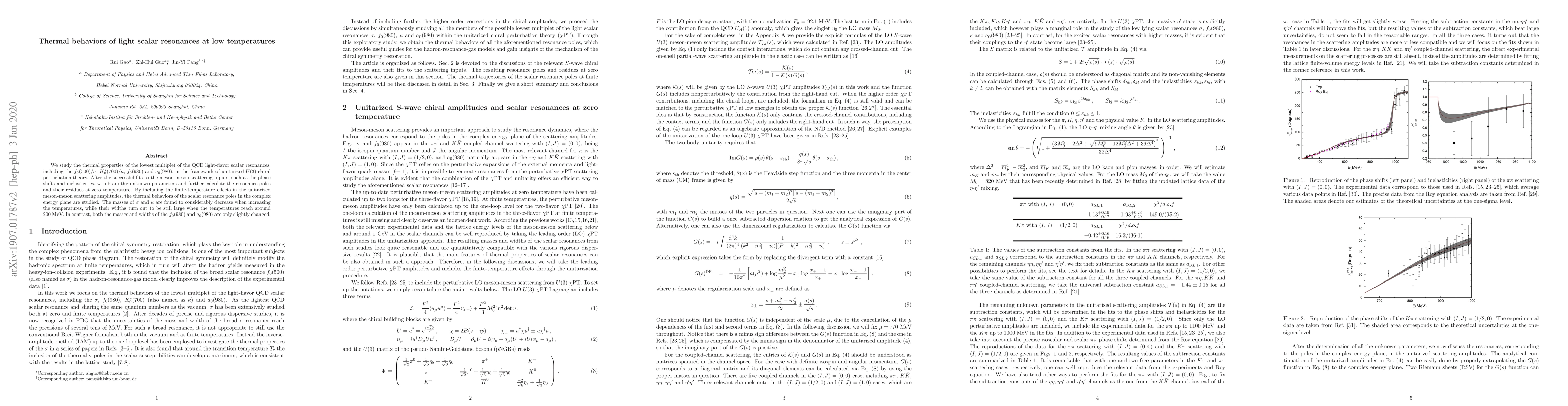 This study uses unitarized U(3) chiral perturbation theory to analyze the thermal behavior of light scalar QCD resonances like sigma (σ), kappa (κ), f0(980), and a0(980). Key findings include significant temperature-induced mass reduction for σ and κ, while their widths remain large even at ~200 MeV. In contrast, f0(980) and a0(980) masses and widths show minimal temperature changes.