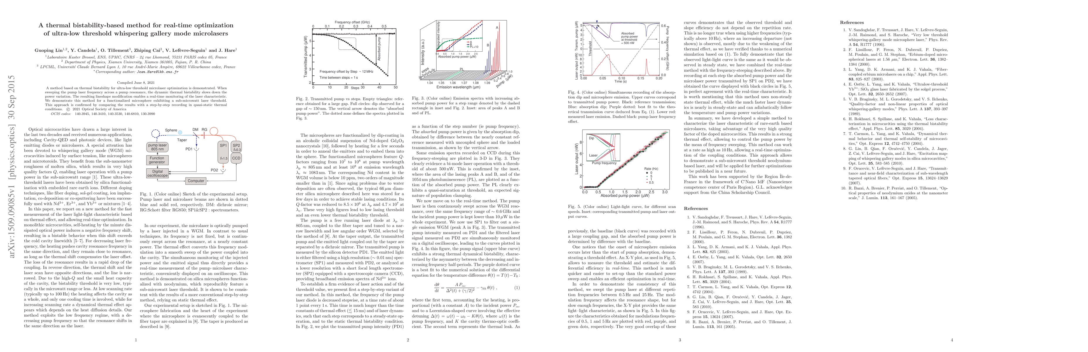 This paper presents a thermal bistability-based method for optimizing ultralow-threshold whispering gallery mode microlasers, enabling real-time monitoring of laser characteristics by slowing down power variation through dynamic thermal bistability. The method is demonstrated for a microlaser with a submicrowatt threshold, validated by comparing it to quasi-static thermal conditions.