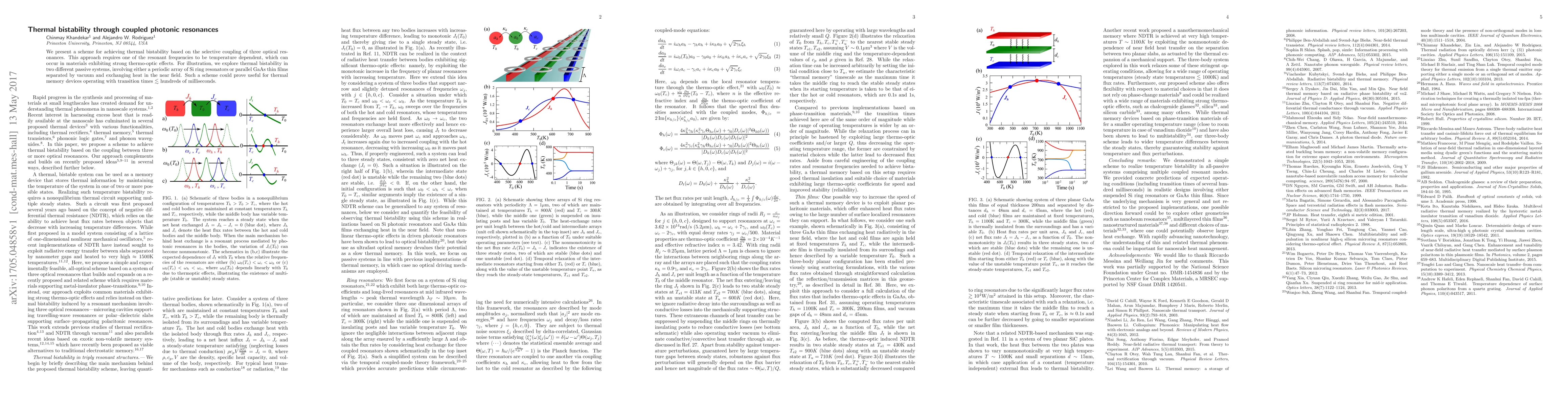 This paper proposes a method for achieving thermal bistability using the selective coupling of three optical resonances, leveraging materials with strong thermo-optic effects. It demonstrates thermal bistability in passive systems like Si ring resonators and GaAs thin films, suggesting potential applications in thermal memory devices.