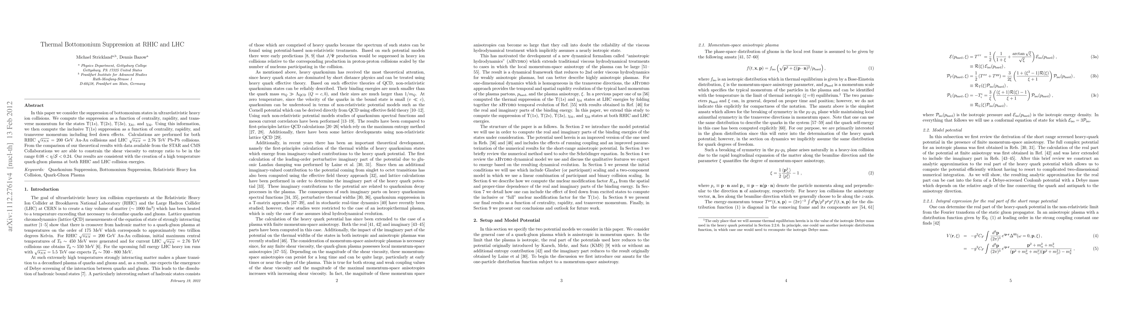 This paper investigates the suppression of bottomonium states in heavy ion collisions at RHIC and LHC, calculating the effects for various centrality, rapidity, and transverse momentum conditions. The study constrains the shear viscosity to entropy ratio and supports the formation of a high-temperature quark-gluon plasma.