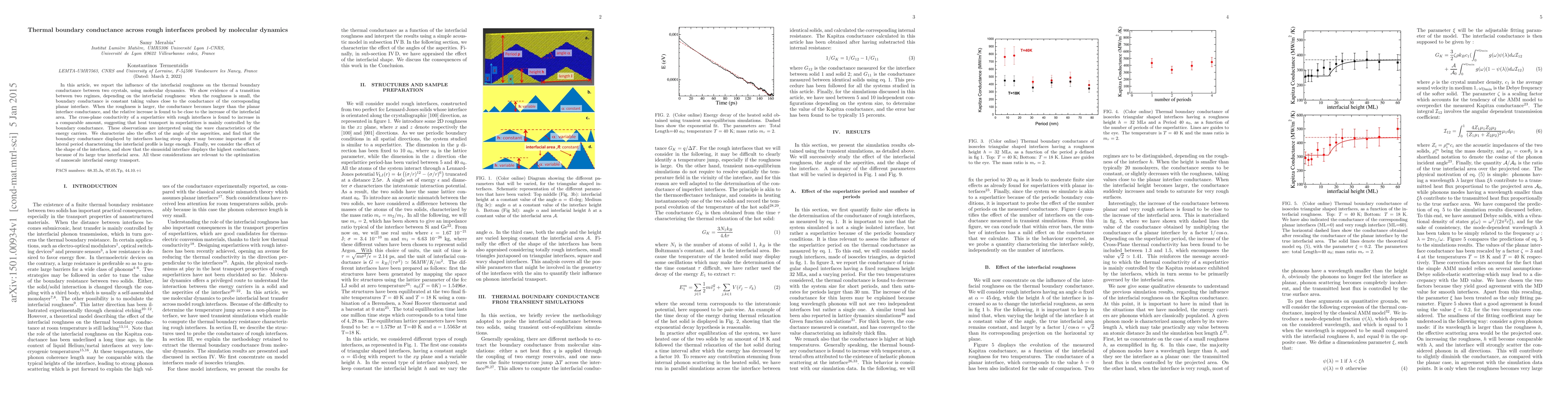In this article, we report the influence of the interfacial roughness on the thermal boundary conductance between two crystals, using molecular dynamics. We show evidence of a transition between two regimes, depending on the interfacial roughness: when the roughness is small, the boundary conductance is constant taking values close to the conductance of the corresponding planar interface. When the roughness is larger, the conductance becomes larger than the planar interface conductance, and the relative increase is found to be close to the increase of the interfacial area. The cross-plane conductivity of a superlattice with rough interfaces is found to increase in a comparable amount, suggesting that heat transport in superlattices is mainly controlled by the boundary conductance. These observations are interpreted using the wave characteristics of the energy carriers. We characterize also the effect of the angle of the asperities, and find that the boundary conductance displayed by interfaces having steep slopes may become important if the lateral period characterizing the interfacial profile is large enough. Finally, we consider the effect of the shape of the interfaces, and show that the sinusoidal interface displays the highest conductance, because of its large true interfacial area. All these considerations are relevant to the optimization of nanoscale interfacial energy transport.