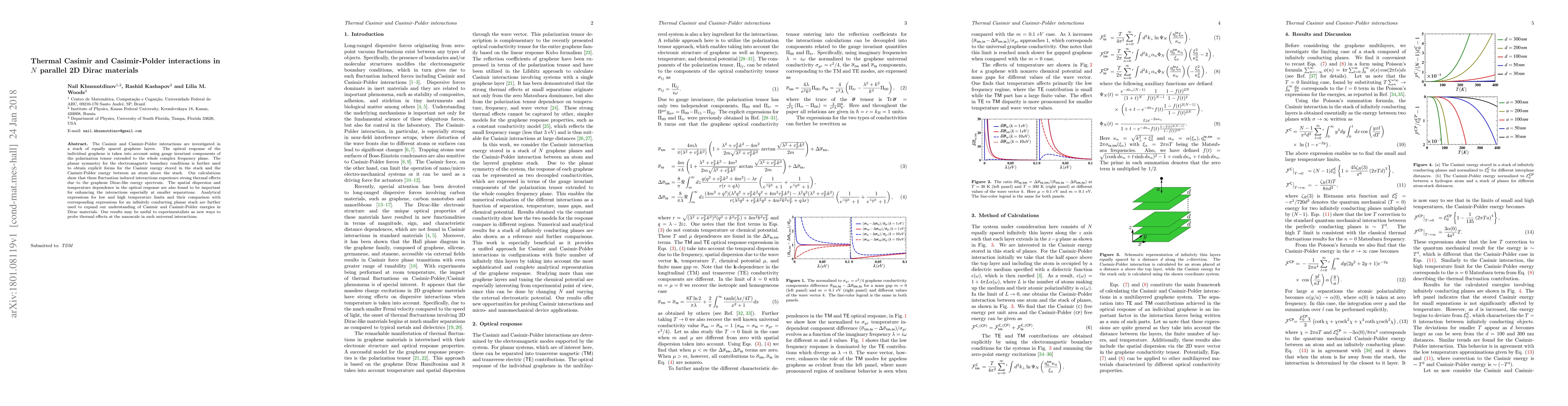 The Casimir and Casimir-Polder interactions are investigated in a stack of equally spaced graphene layers. The optical response of the individual graphene is taken into account using gauge invariant components of the polarization tensor extended to the whole complex frequency plane. The planar symmetry for the electromagnetic boundary conditions is further used to obtain explicit forms for the Casimir energy stored in the stack and the Casimir-Polder energy between an atom above the stack. Our calculations show that these fluctuation induced interactions experience strong thermal effects due to the graphene Dirac-like energy spectrum. The spatial dispersion and temperature dependence in the optical response are also found to be important for enhancing the interactions especially at smaller separations. Analytical expressions for low and high temperature limits and their comparison with corresponding expressions for an infinitely conducting planar stack are further used to expand our understanding of Casimir and Casimir-Polder energies in Dirac materials. Our results may be useful to experimentalists as new ways to probe thermal effects at the nanoscale in such universal interactions.