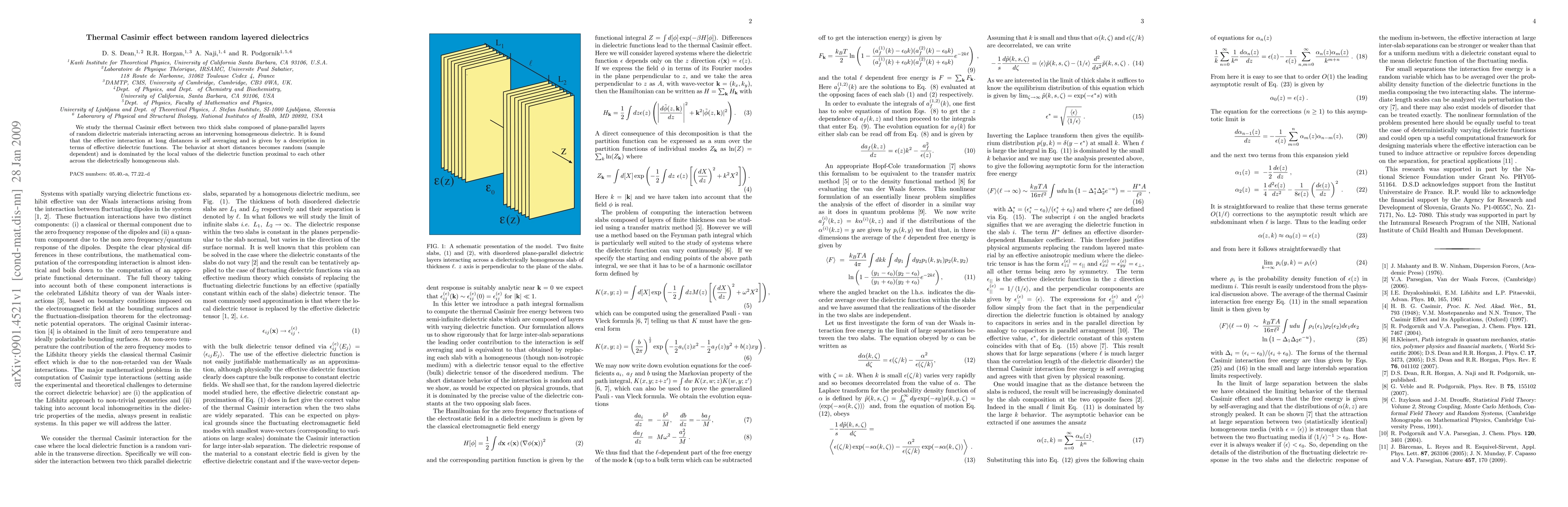 Researchers studied the thermal Casimir effect between two thick slabs of random dielectric materials, finding that it is self-averaging at long distances, while behavior at short distances is sample-dependent and influenced by local values of the dielectric function.