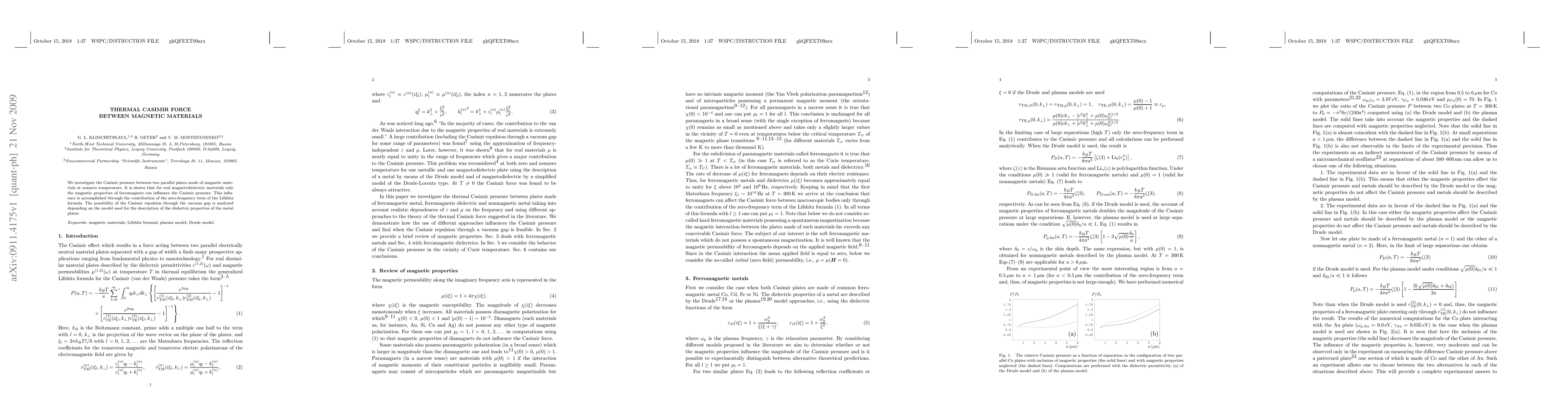 This paper examines the thermal Casimir effect between parallel plates of magnetic materials at nonzero temperatures, demonstrating that only ferromagnets' magnetic properties can influence the Casimir pressure, primarily through the zero-frequency term of the Lifshitz formula, and explores the potential for Casimir repulsion based on different dielectric property models.
