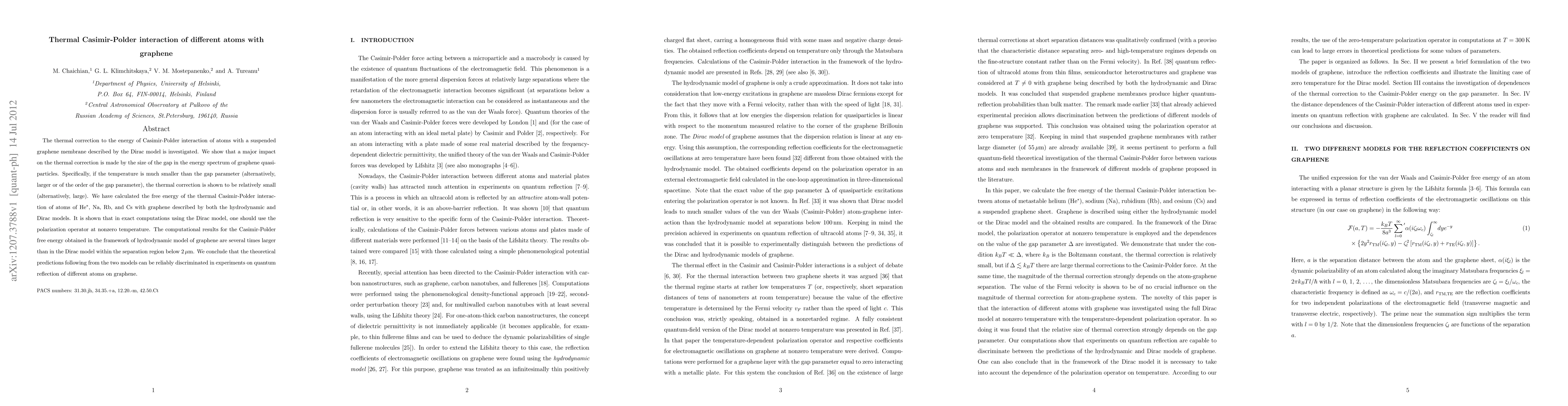 This paper investigates the thermal Casimir-Polder interaction between various atoms and graphene, showing that the size of the graphene gap significantly affects the thermal correction. The Dirac model predicts smaller thermal corrections compared to the hydrodynamic model, suggesting experimental discrimination between the two models via quantum reflection experiments.