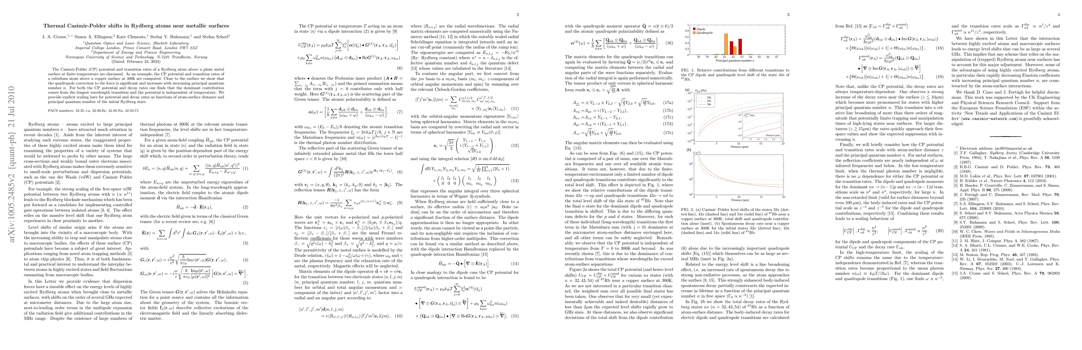 The Casimir-Polder (CP) potential and transition rates of a Rydberg atom above a plane metal surface at finite temperature are discussed. As an example, the CP potential and transition rates of a rubidium atom above a copper surface at room temperature is computed. Close to the surface we show that the quadrupole correction to the force is significant and increases with increasing principal quantum number n. For both the CP potential and decay rates one finds that the dominant contribution comes from the longest wavelength transition and the potential is independent of temperature. We provide explicit scaling laws for potential and decay rates as functions of atom-surface distance and principal quantum number of the initial Rydberg state.