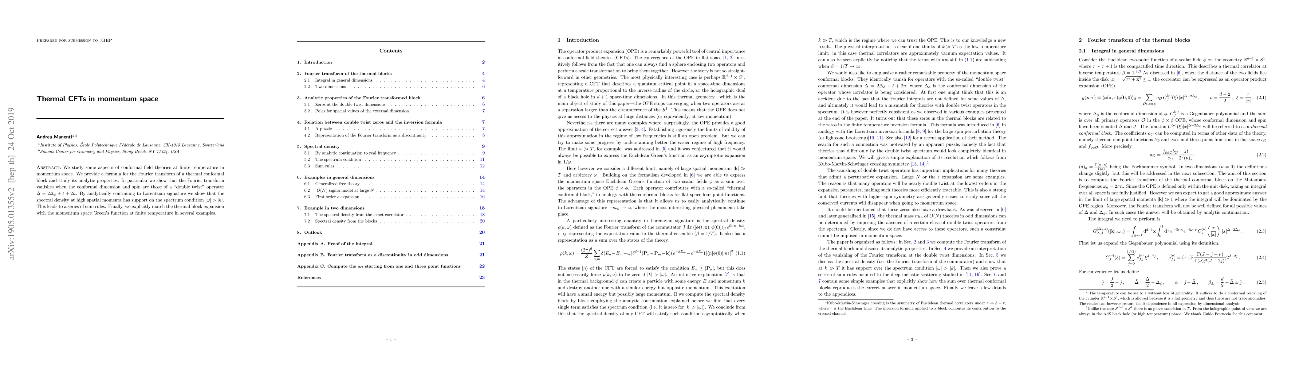 We study some aspects of conformal field theories at finite temperature in momentum space. We provide a formula for the Fourier transform of a thermal conformal block and study its analytic properties. In particular we show that the Fourier transform vanishes when the conformal dimension and spin are those of a "double twist" operator $\Delta = 2\Delta_\phi + \ell + 2n$. By analytically continuing to Lorentzian signature we show that the spectral density at high spatial momenta has support on the spectrum condition $|\omega| > |k|$. This leads to a series of sum rules. Finally, we explicitly match the thermal block expansion with the momentum space Green's function at finite temperature in several examples.