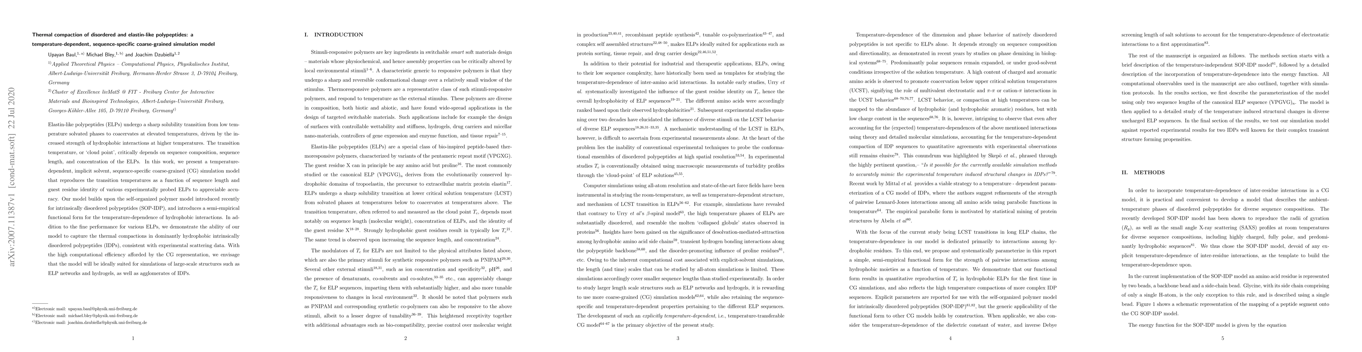This paper introduces a temperature-dependent, sequence-specific coarse-grained simulation model for elastin-like polypeptides (ELPs) that accurately reproduces their solubility transition temperatures. The model also effectively captures thermal compactions in hydrophobic intrinsically disordered polypeptides, offering potential for large-scale simulations of ELP networks and hydrogels.