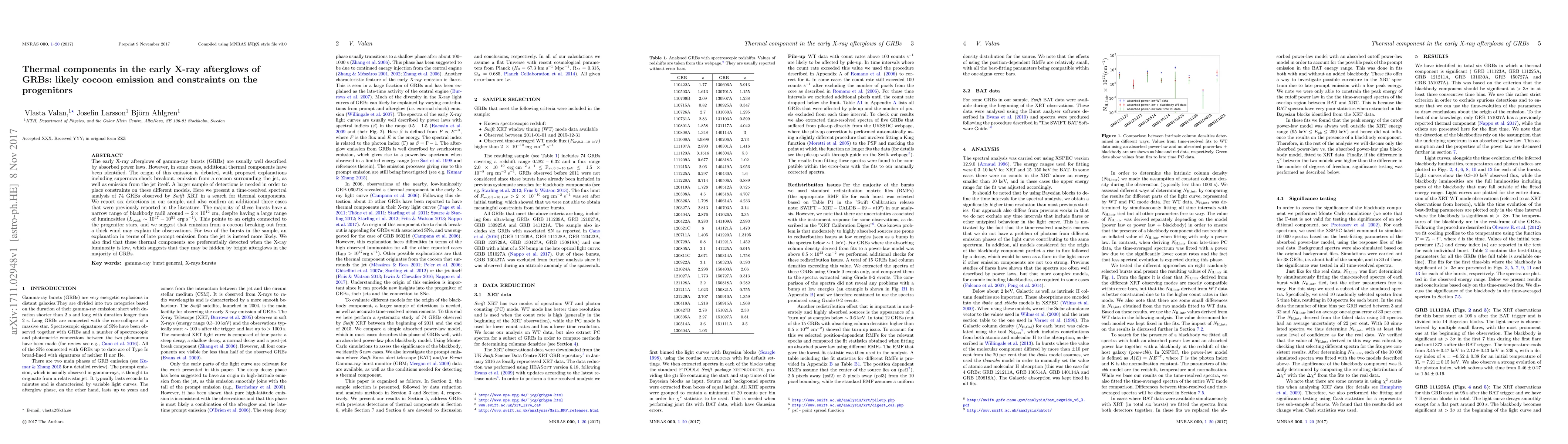 This study investigates thermal components in the early X-ray afterglows of gamma-ray bursts (GRBs) using Swift XRT data, identifying six new detections and confirming three previous cases. The findings suggest that the thermal emission likely originates from a cocoon surrounding the jet, with implications for the progenitor stars, and is more detectable when the X-ray luminosity is low.