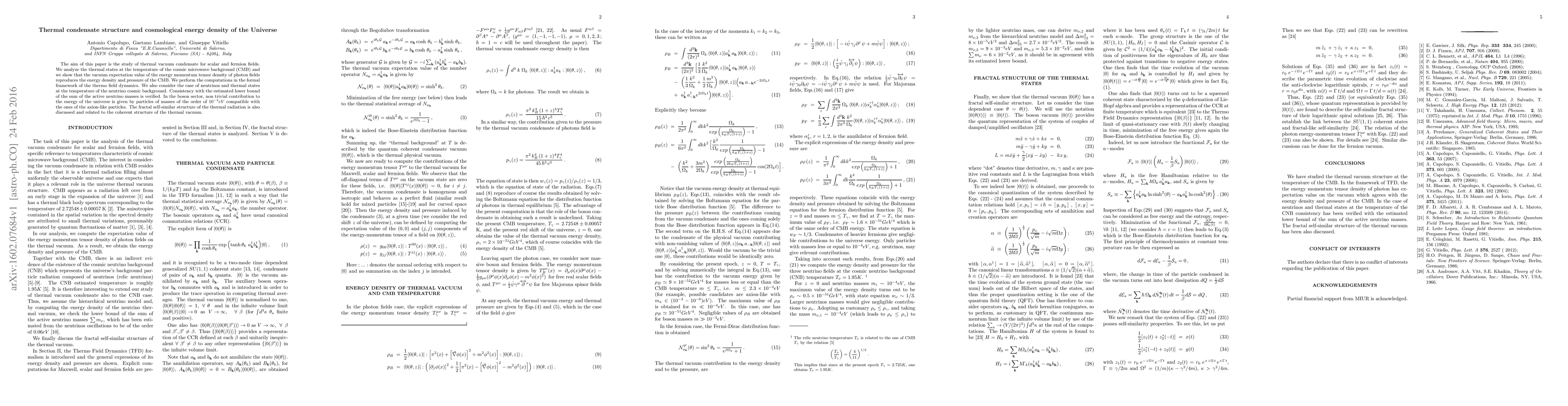 The aim of this paper is the study of thermal vacuum condensate for scalar and fermion fields. We analyze the thermal states at the temperature of the cosmic microwave background (CMB) and we show that the vacuum expectation value of the energy momentum tensor density of photon fields reproduces the energy density and pressure of the CMB. We perform the computations in the formal framework of the thermo field dynamics. We also consider the case of neutrinos and thermal states at the temperature of the neutrino cosmic background. Consistency with the estimated lower bound of the sum of the active neutrino masses is verified. In the boson sector, non trivial contribution to the energy of the universe is given by particles of masses of the order of $10^{-4}eV$ compatible with the ones of the axion-like particles. The fractal self-similar structure of the thermal radiation is also discussed and related to the coherent structure of the thermal vacuum.