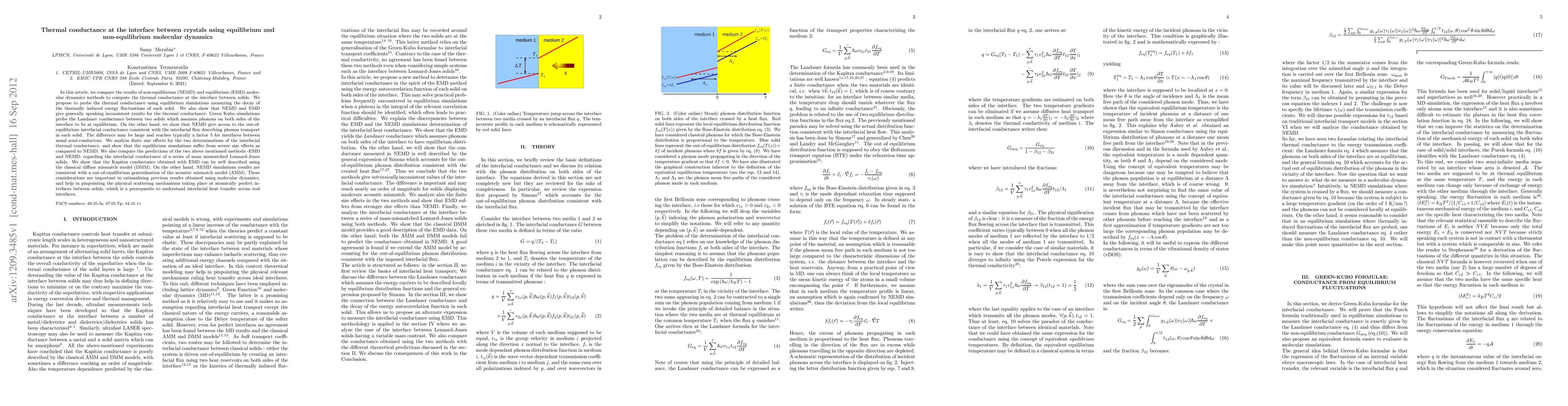 In this article, we compare the results of non-equilibrium (NEMD) and equilibrium (EMD) molecular dynamics methods to compute the thermal conductance at the interface between solids. We propose to probe the thermal conductance using equilibrium simulations measuring the decay of the thermally induced energy fluctuations of each solid. We also show that NEMD and EMD give generally speaking inconsistent results for the thermal conductance: Green Kubo simulations probe the Landauer conductance between two solids which assumes phonons on both sides of the interface to be at equilibrium. On the other hand, we show that NEMD give access to the out-of-equilibrium interfacial conductance consistent with the interfacial flux describing phonon transport in each solid. The difference may be large and reaches typically a factor 5 for interfaces between usual semi-conductors. We analyze finite size effects for the two determinations of the interfacial thermal conductance, and show that the equilibrium simulations suffer from severe size effects as compared to NEMD. We also compare the predictions of the two above mentioned methods -EMD and NEMD- regarding the interfacial conductance of a series of mass mismatched Lennard-Jones solids. We show that the Kapitza conductance obtained with EMD can be well described using the classical diffuse mismatch model (DMM). On the other hand, NEMD simulations results are consistent with a out-of-equilibrium generalisation of the acoustic mismatch model (AMM). These considerations are important in rationalizing previous results obtained using molecular dynamics, and help in pinpointing the physical scattering mechanisms taking place at atomically perfect interfaces between solids, which is a prerequesite to understand interfacial heat transfer across real interfaces.