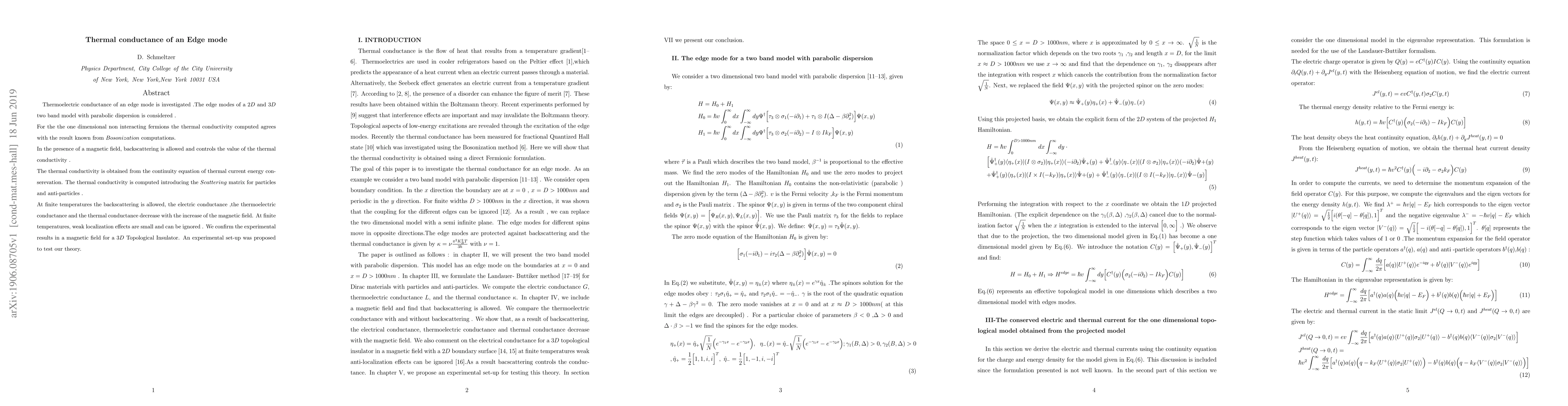 Thermoelectric conductance of an edge mode is investigated. The edge modes of a $2D $ and $3D$ two band model with parabolic dispersion is considered. For the the one dimensional non interacting fermions the thermal conductivity computed agrees with the result known from $Bosonization$ computations. In the presence of a magnetic field, backscattering is allowed and controls the value of the thermal conductivity. The thermal conductivity is obtained from the continuity equation of thermal current energy conservation. The thermal conductivity is computed introducing the $Scattering$ matrix for particles and anti-particles. At finite temperatures the backscattering is allowed, the electric conductance, the thermoelectric conductance and the thermal conductance decrease with the increase of the magnetic field. At finite temperatures, weak localization effects are small and can be ignored. We confirm the experimental results in a magnetic field for a $3D$ Topological Insulator. An experimental set-up was proposed to test our theory.