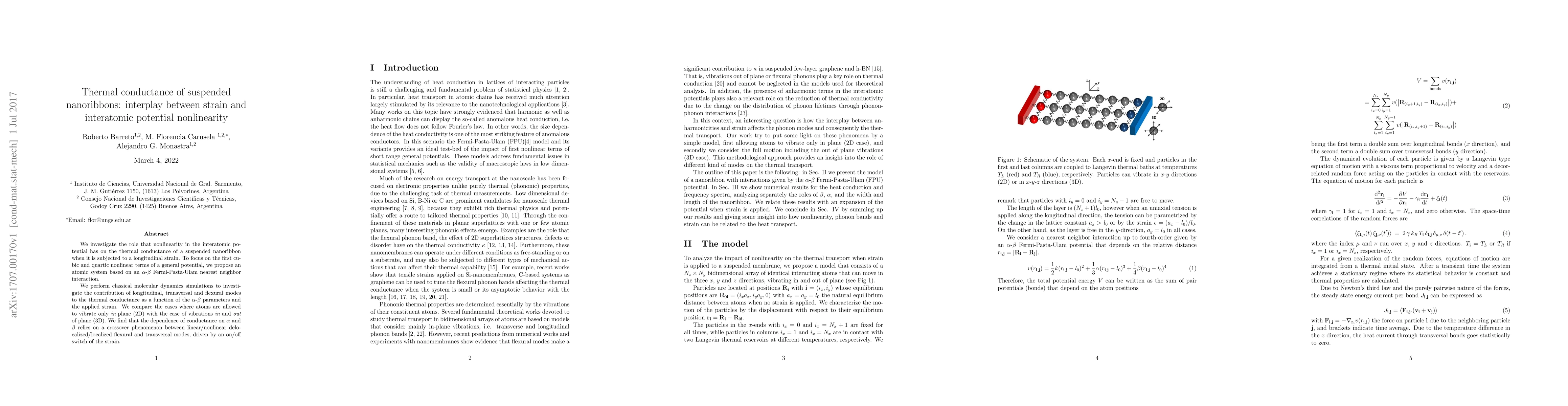 We investigate the role that nonlinearity in the interatomic potential has on the thermal conductance of a suspended nanoribbon when it is subjected to a longitudinal strain. To focus on the first cubic and quartic nonlinear terms of a general potential, we propose an atomic system based on an $\alpha$-$\beta$ Fermi-Pasta-Ulam nearest neighbor interaction. We perform classical molecular dynamics simulations to investigate the contribution of longitudinal, transversal and flexural modes to the thermal conductance as a function of the $\alpha$-$\beta$ parameters and the applied strain. We compare the cases where atoms are allowed to vibrate only {\it in} plane (2D) with the case of vibrations {\it in} and {\it out} of plane (3D). We find that the dependence of conductance on $\alpha$ and $\beta$ relies on a crossover phenomenon between linear/nonlinear delocalized/localized flexural and transversal modes, driven by an on/off switch of the strain.