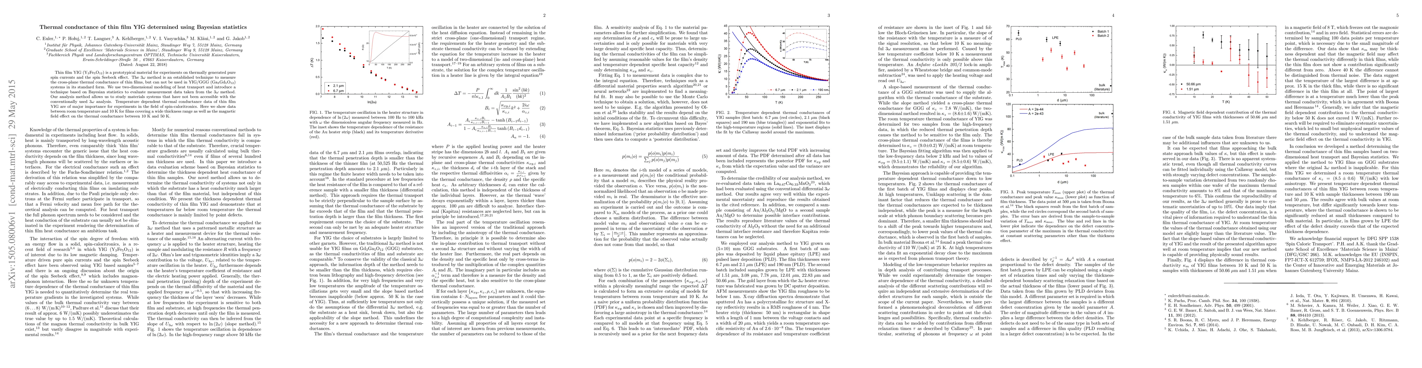 Thin film YIG (Y$_3$Fe$_5$O$_{12}$) is a prototypical material for experiments on thermally generated pure spin currents and the spin Seebeck effect. The 3-omega method is an established technique to measure the cross-plane thermal conductance of thin films, but can not be used in YIG/GGG (Ga$_3$Gd$_5$O$_{12}$) systems in its standard form. We use two-dimensional modeling of heat transport and introduce a technique based on Bayesian statistics to evaluate measurement data taken from the 3-omega method. Our analysis method allows us to study materials systems that have not been accessible with the conventionally used 3-omega analysis. Temperature dependent thermal conductance data of thin film YIG are of major importance for experiments in the field of spin-caloritronics. Here we show data between room temperature and 10 K for films covering a wide thickness range as well as the magnetic field effect on the thermal conductance between 10 K and 50 K.