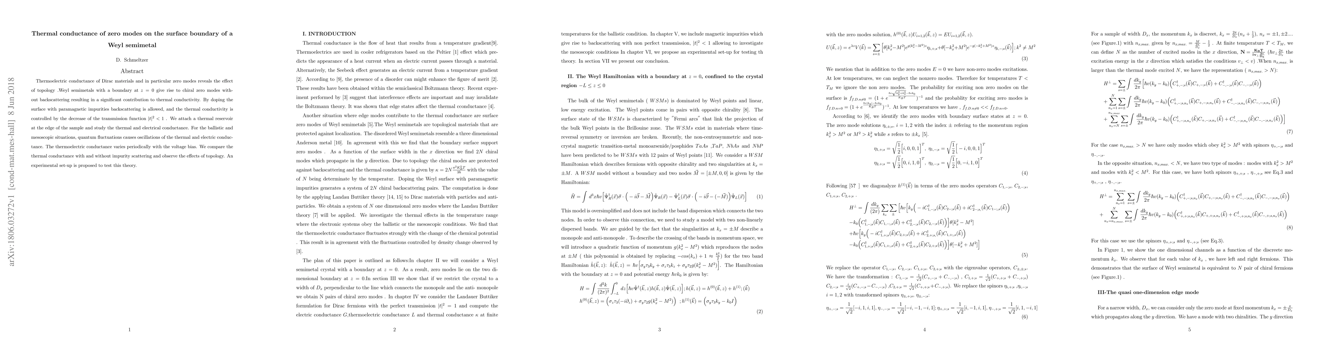 Thermoelectric conductance of Dirac materials and in particular zero modes reveals the effect of topology .Weyl semimetals with a boundary at z = 0 give rise to chiral zero modes with- out backscattering resulting in a significant contribution to thermal conductivity. By doping the surface with paramagnetic impurities backscattering is allowed, and the thermal conductivity is controlled by the decrease of the transmission function |t|^{2} < 1. We attach a thermal reservoir at the edge of the sample and study the thermal and electrical conductance. For the ballistic and mesoscopic situations, quantum uctuations causes oscillations of the thermal and electric conduc- tance. The thermoelectric conductance varies periodically with the voltage bias. We compare the thermal conductance with and without impurity scattering and observe the effects of topology. An experimental set-up is proposed to test this theory. 1Thermoelectric conductance of Dirac materials and in particular zero modes reveals the effect of topology .Weyl semimetals with a boundary at z = 0 give rise to chiral zero modes with- out backscattering resulting in a significant contribution to thermal conductivity. By doping the surface with paramagnetic impurities backscattering is allowed, and the thermal conductivity is controlled by the decrease of the transmission function |t|^{2} < 1 . We attach a thermal reservoir at the edge of the sample and study the thermal and electrical conductance. For the ballistic and mesoscopic situations, quantum uctuations causes oscillations of the thermal and electric conduc- tance. The thermoelectric conductance varies periodically with the voltage bias. We compare the thermal conductance with and without impurity scattering and observe the effects of topology. An experimental set-up is proposed to test this theory.
