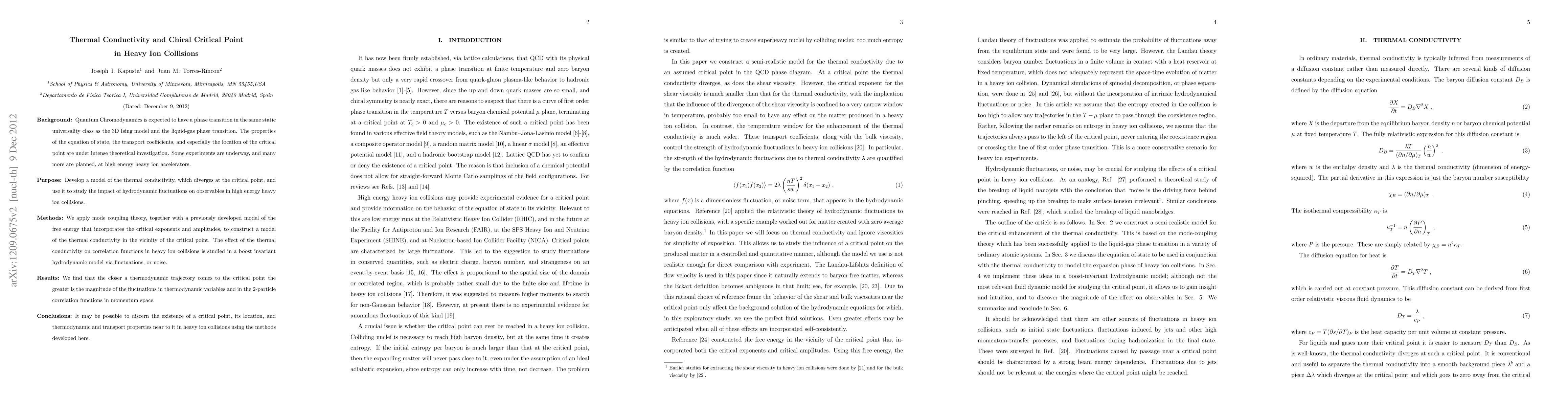 This paper develops a model for thermal conductivity near the chiral critical point in heavy ion collisions, using mode coupling theory and hydrodynamic fluctuations. The study finds that proximity to the critical point enhances fluctuations in thermodynamic variables and 2-particle correlations, suggesting these methods could reveal critical point properties in experiments.