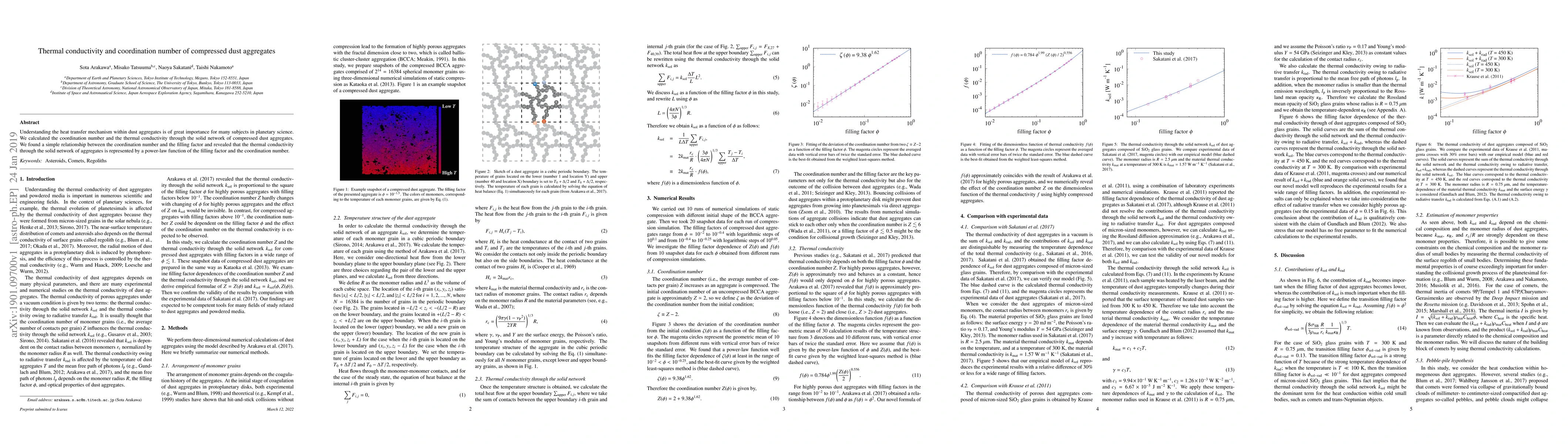 This paper investigates the heat transfer mechanism in compressed dust aggregates, finding a relationship between coordination number and filling factor, and demonstrating that thermal conductivity follows a power-law function dependent on these factors.