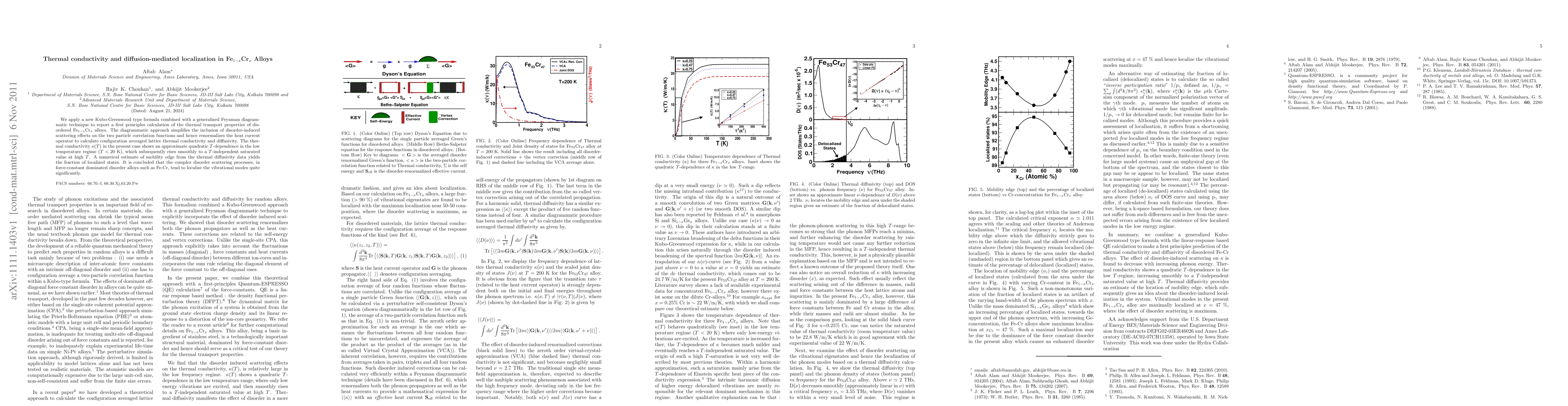 We apply a new Kubo-Greenwood type formula combined with a generalized Feynman diagram- matic technique to report a first principles calculation of the thermal transport properties of disordered Fe_{1-x}Cr_{x} alloys. The diagrammatic approach simplifies the inclusion of disorder-induced scattering effects on the two particle correlation functions and hence renormalizes the heat current operator to calculate configuration averaged lattice thermal conductivity and diffusivity. The thermal conductivity K(T) in the present case shows an approximate quadratic T-dependence in the low temperature regime (T < 20 K), which subsequently rises smoothly to a T-independent saturated value at high T . A numerical estimate of mobility edge from the thermal diffusivity data yields the fraction of localized states. It is concluded that the complex disorder scattering processes, in force-constant dominated disorder alloys such as Fe-Cr, tend to localize the vibrational modes quite significantly.
