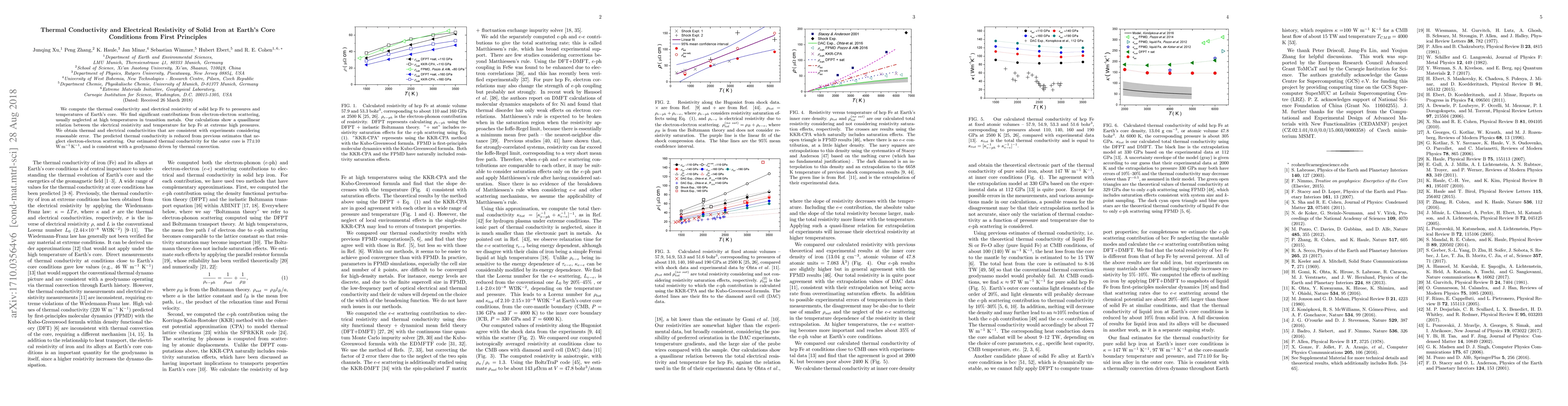 This study calculates the thermal conductivity and electrical resistivity of solid hcp iron at Earth's core conditions, finding significant electron-electron scattering contributions. The research reveals a quasi-linear relationship between resistivity and temperature, predicting a thermal conductivity of 77±10 W/m/K for the outer core, which is lower than previous estimates and supports a geodynamo driven by thermal convection.