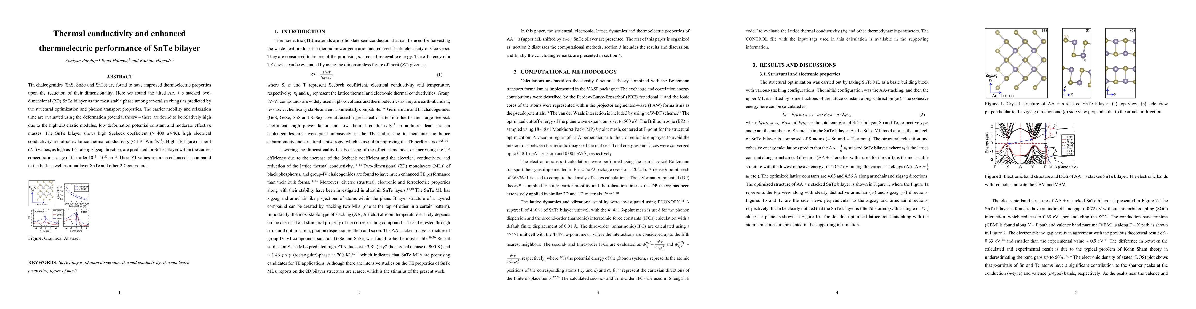 Tin chalcogenides (SnS, SnSe, and SnTe) are found to have improved thermoelectric properties upon the reduction of their dimensionality. Here we found the tilted AA + s stacked two-dimensional (2D) SnTe bilayer as the most stable phase among several stackings as predicted by the structural optimization and phonon transport properties. The carrier mobility and relaxation time are evaluated using the deformation potential theory, which is found to be relatively high due to the high 2D elastic modulus, low deformation potential constant, and moderate effective masses. The SnTe bilayer shows a high Seebeck coefficient, high electrical conductivity, and ultralow lattice thermal conductivity. High TE figure of merit (ZT) values, as high as 4.61 along the zigzag direction, are predicted for the SnTe bilayer. These ZT values are much enhanced as compared to the bulk as well as monolayer SnTe and other 2D compounds.