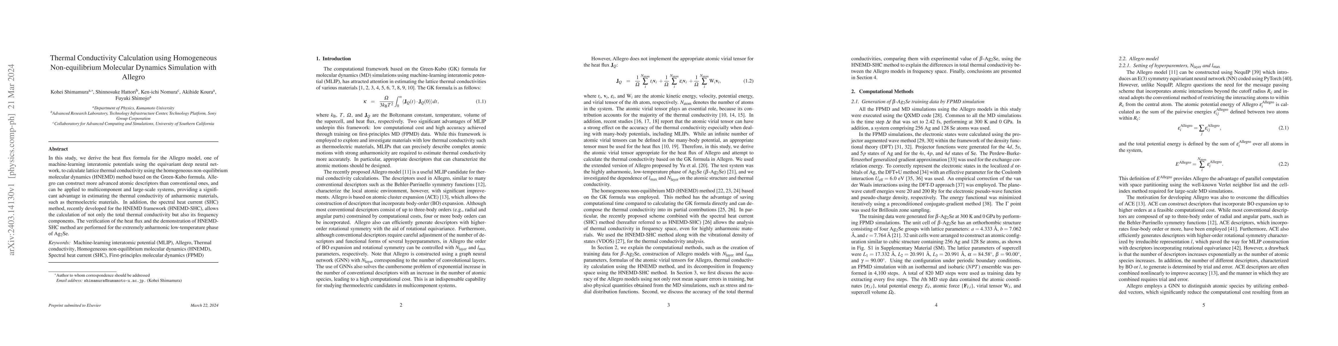 This study uses the Allegro machine-learning interatomic potential within a homogeneous non-equilibrium molecular dynamics (HNEMD) framework to calculate lattice thermal conductivity via the Green-Kubo formula, demonstrating the SHC method for frequency-dependent thermal conductivity, validated on Ag$_2$Se.