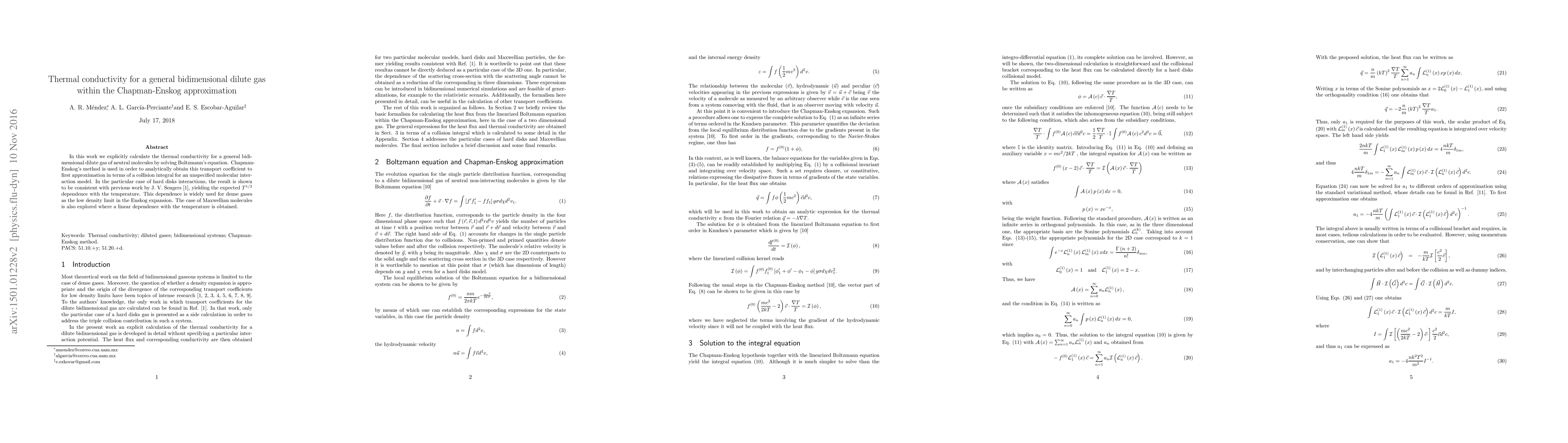 In this work we explicitly calculate the thermal conductivity for a general bidimensional dilute gas of neutral molecules by solving Boltzmann's equation. Chapman-Enskog's method is used in order to analytically obtain this transport coefficient to first approximation in terms of a collision integral for an unspecified molecular interaction model. In the particular case of hard disks interactions, the result is shown to be consistent with previous work by J. V. Sengers \cite{Sengers}, yielding the expected $T^{1/2}$ dependence with the temperature. This dependence is widely used for dense gases as the low density limit in the Enskog expansion. The case of Maxwellian molecules is also explored where a linear dependence with the temperature is obtained.