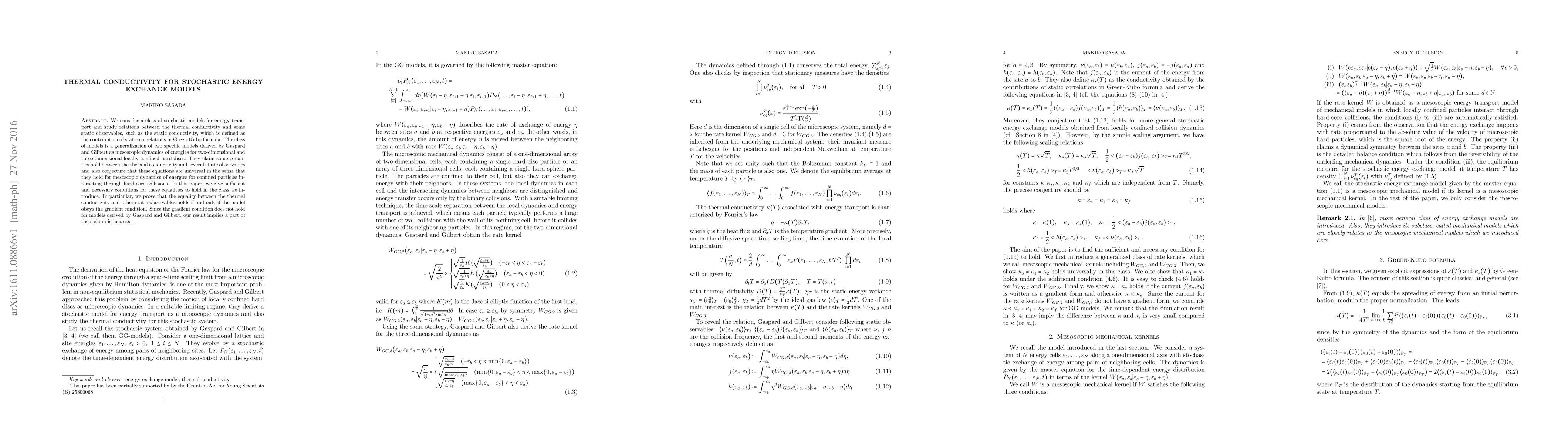 This paper investigates stochastic energy transport models, establishing conditions for the equality between thermal conductivity and static observables. It finds that such equalities hold only if the model satisfies the gradient condition, contradicting previous claims by Gaspard and Gilbert for their specific hard-disc models.