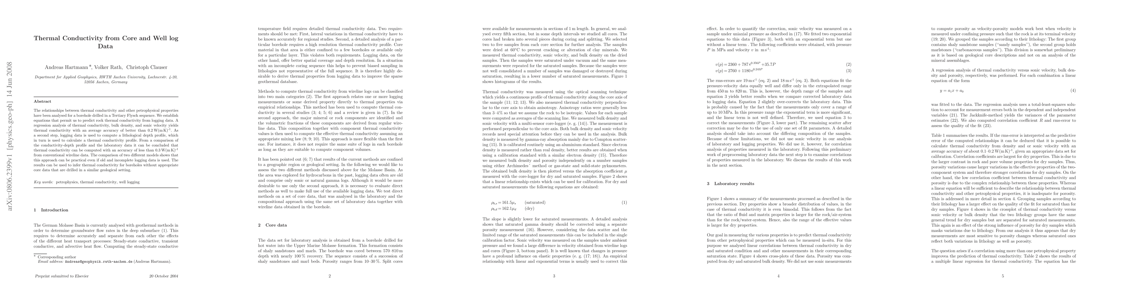 The relationships between thermal conductivity and other petrophysical properties have been analysed for a borehole drilled in a Tertiary Flysch sequence. We establish equations that permit us to predict rock thermal conductivity from logging data. A regression analysis of thermal conductivity, bulk density, and sonic velocity yields thermal conductivity with an average accuracy of better than 0.2 W/(m K). As a second step, logging data is used to compute a lithological depth profile, which in turn is used to calculate a thermal conductivity profile. From a comparison of the conductivity-depth profile and the laboratory data it can be concluded that thermal conductivity can be computed with an accuracy of less than 0.3 W/(m K)from conventional wireline data. The comparison of two different models shows that this approach can be practical even if old and incomplete logging data is used. The results can be used to infer thermal conductivity for boreholes without appropriate core data that are drilled in a similar geological setting.
